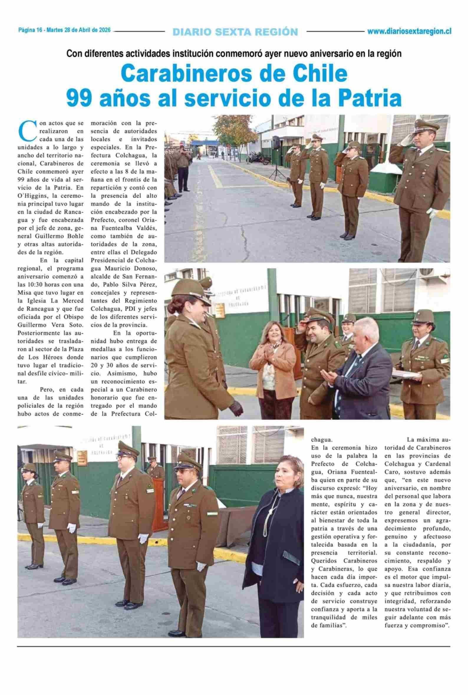 Carabineros de Chile 99 años al servicio de la Patria 28-04-2026 Diario VI Región |