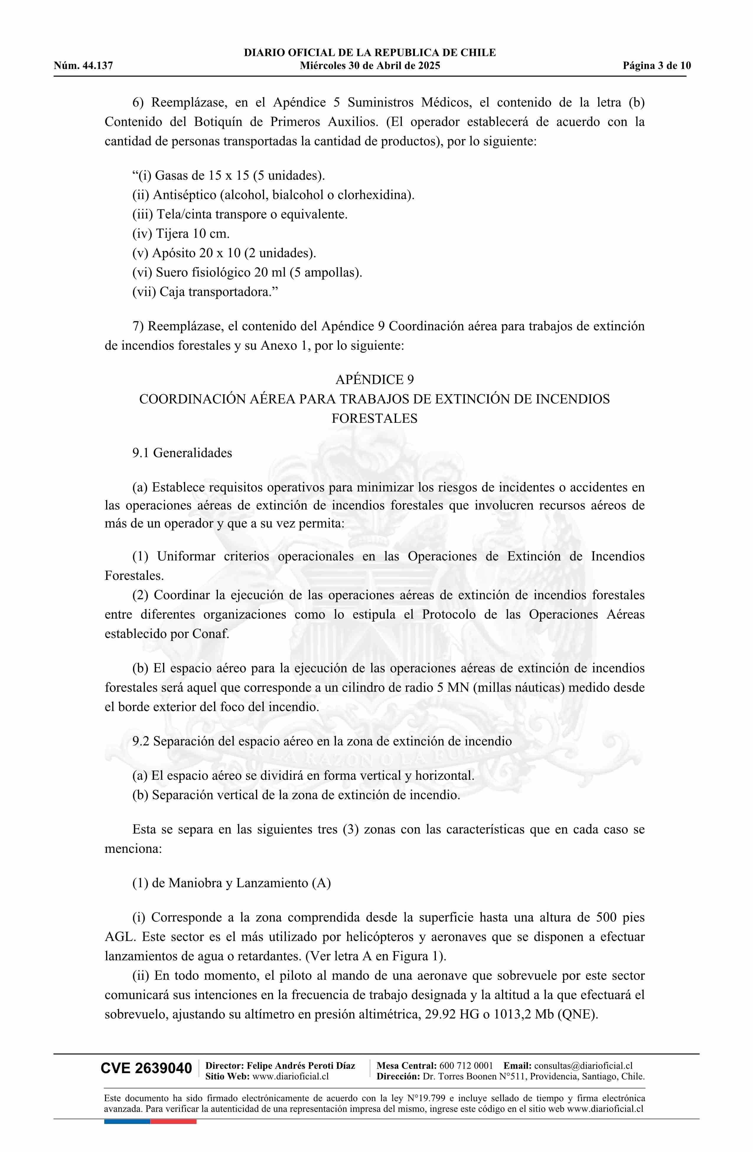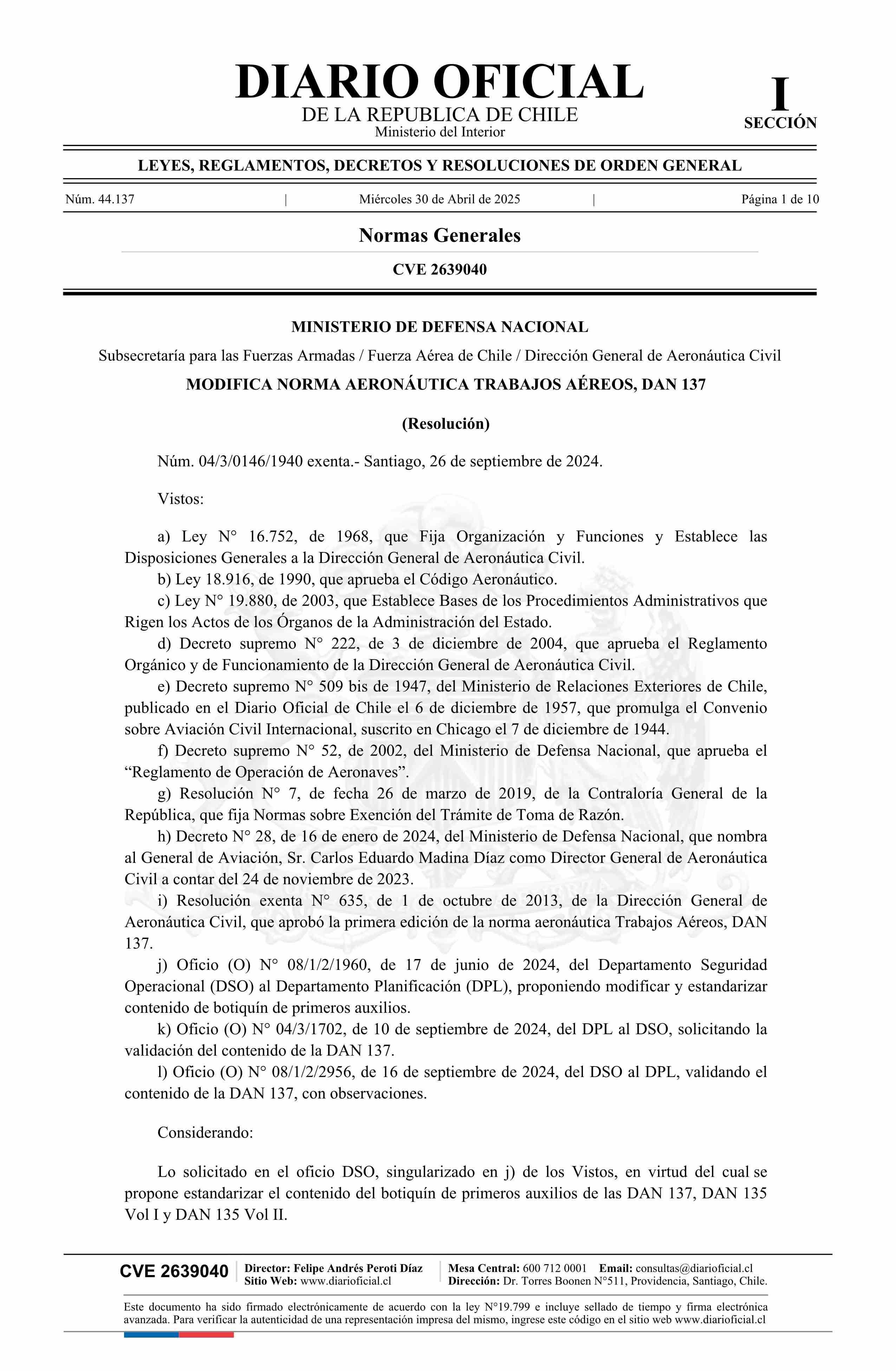 Título: Resolución exenta número 04/3/0146/1940, de 2024.- Modifica Norma Aeronáutica Trabajos Aéreos, DAN 137