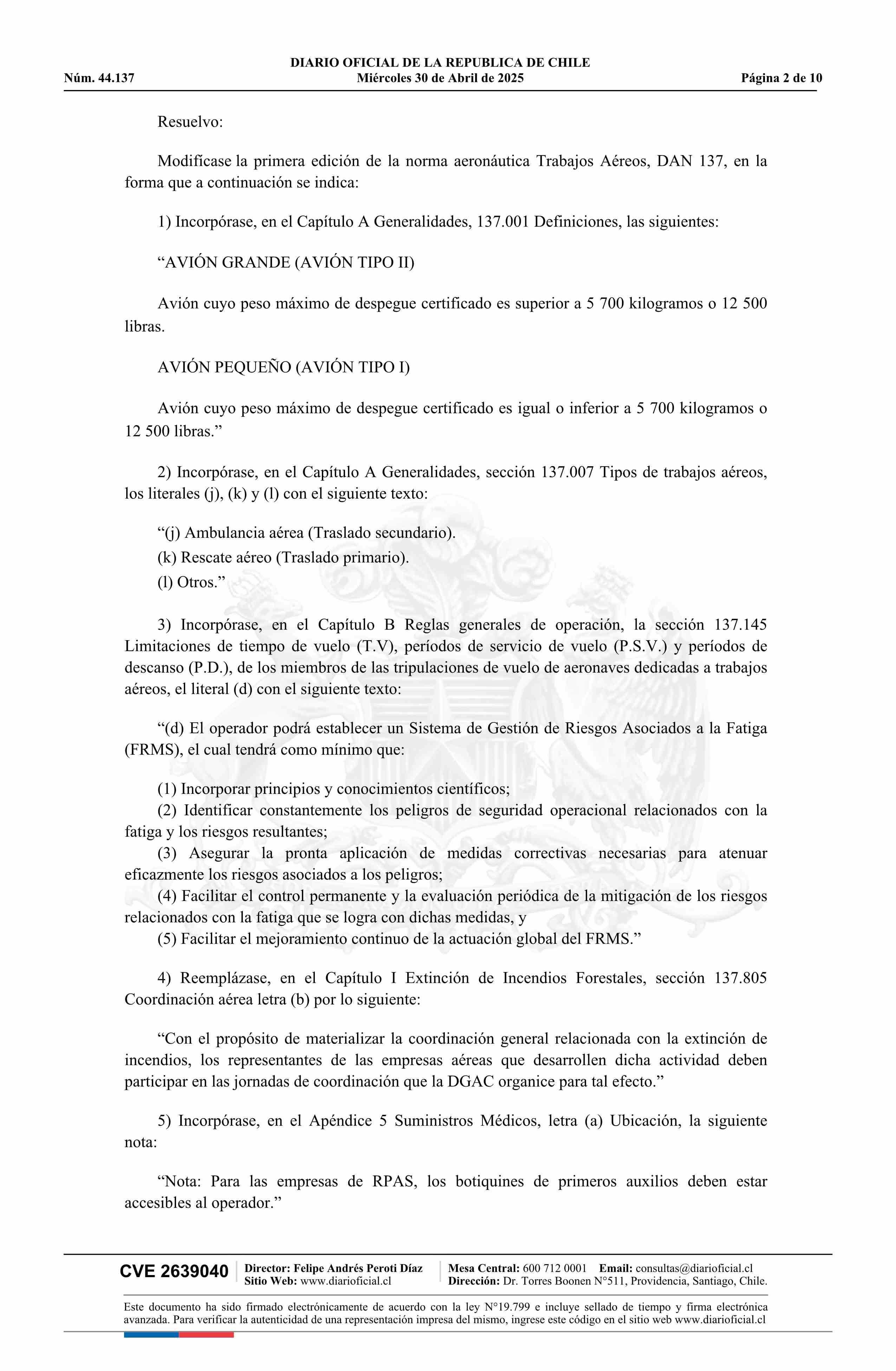Resolución exenta número 04/3/0146/1940, de 2024.- Modifica Norma Aeronáutica Trabajos Aéreos, DAN 137