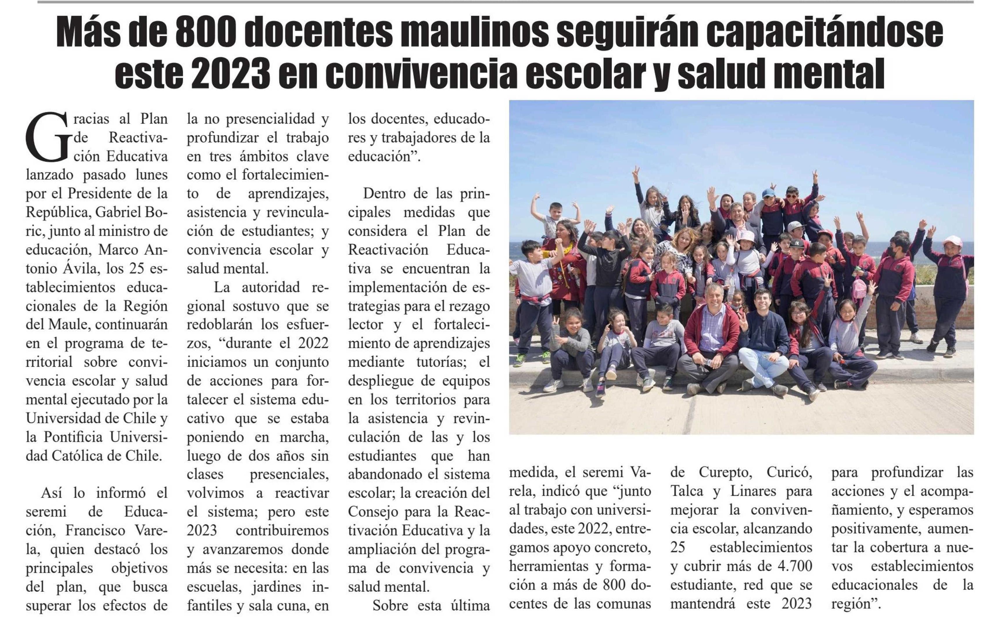 | Título: | Más de 800 docentes maulinos seguirán capacitándose este 2023 en convivencia escolar y salud mental |