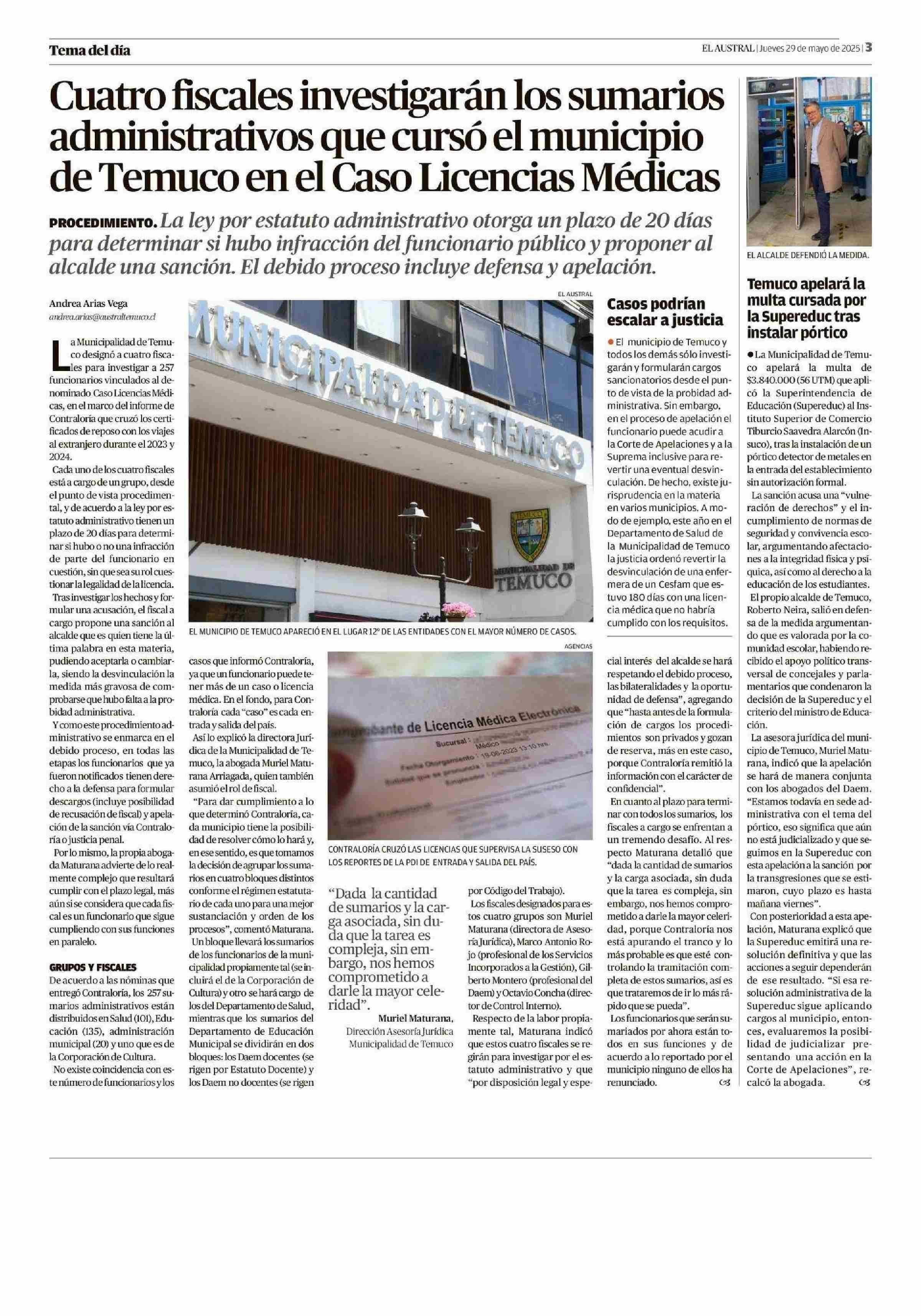 Cuatro fiscales investigarán los sumarios administrativos que cursó el municipio de Temuco en el Caso Licencias Médicas 29-05-2025 El Austral de la Araucanía |