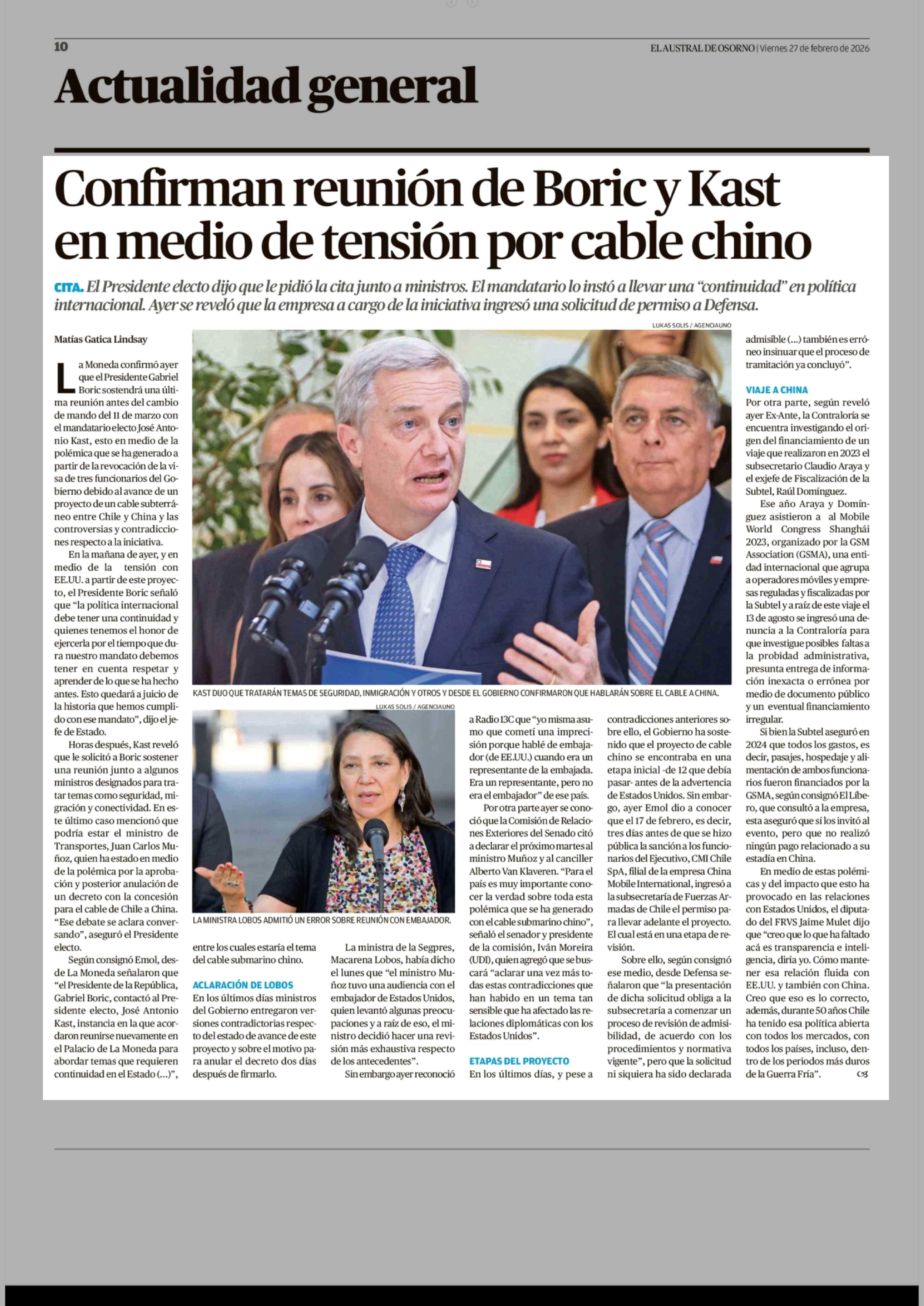 Título: Confirman reunión de Boric y Kast en medio de tensión por cable chino
