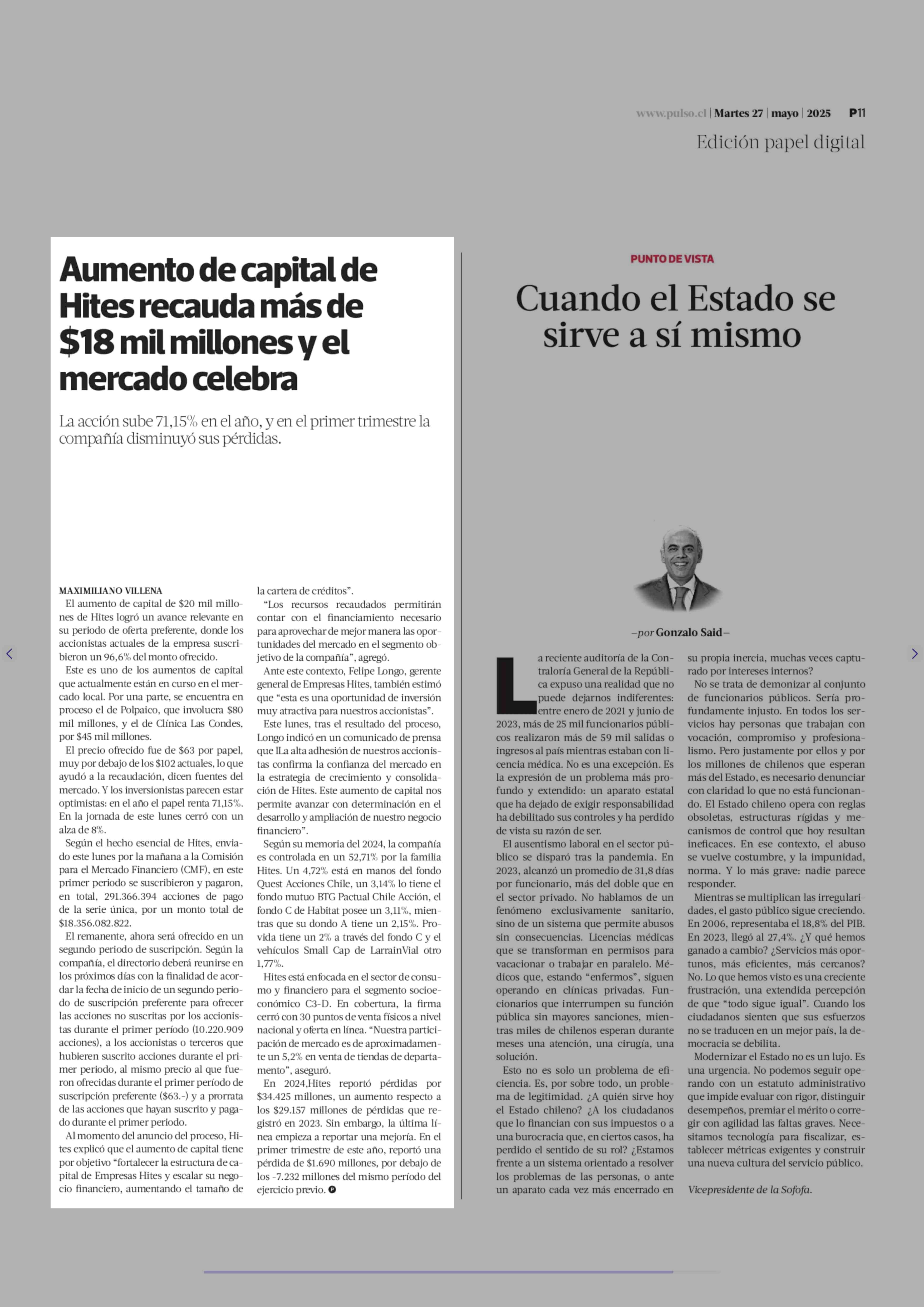 Aumento de capital de Hites recauda más de $18 mil millones y el mercado celebra 27-05-2025 La Tercera |