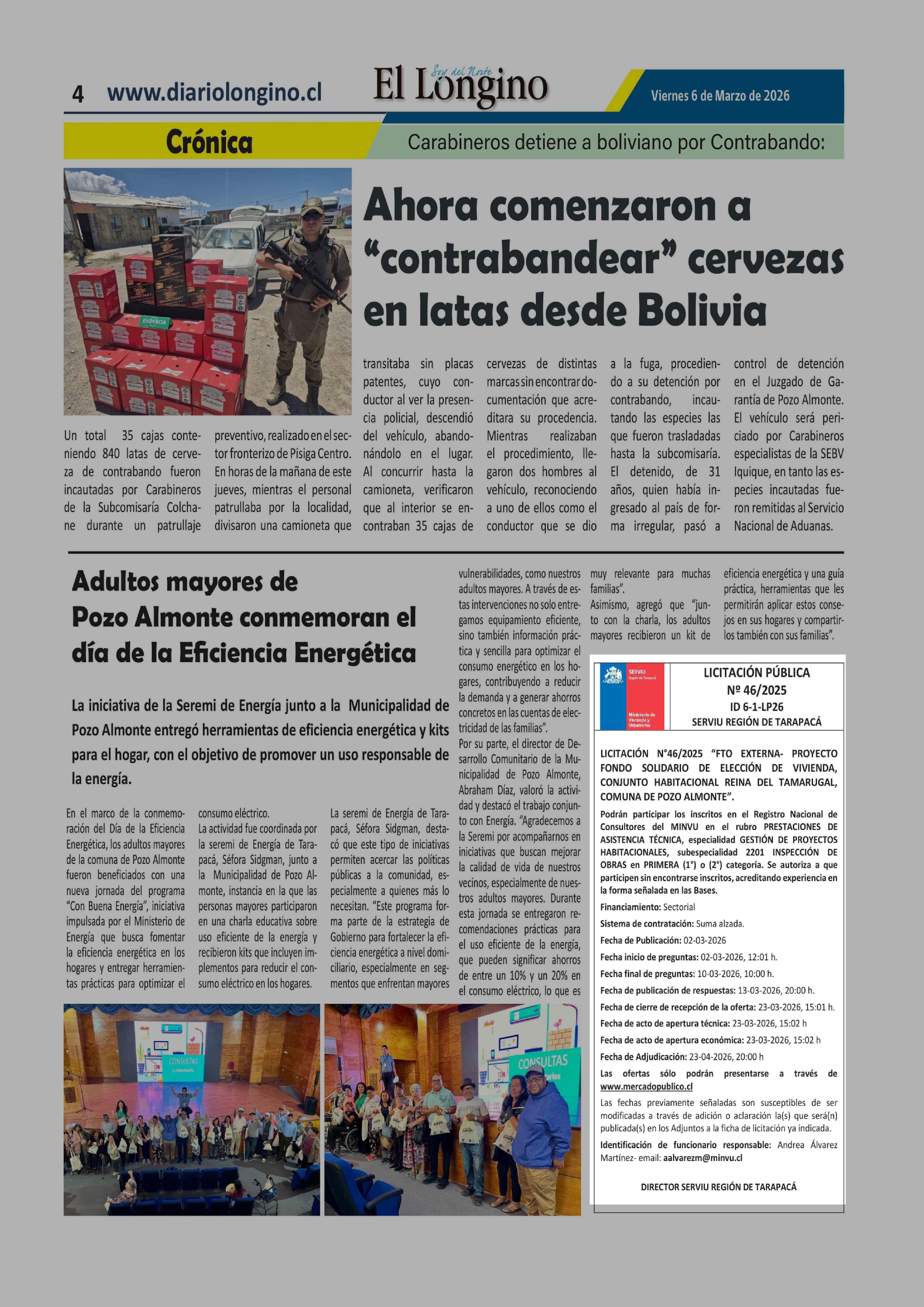 Aviso Licitaciones: LICITACIÓN PÚBLICA Nº 46/2025 ID 6-1-LP26 SERVIU REGIÓN DE TARAPACÁ 06-03-2026 El Longino |