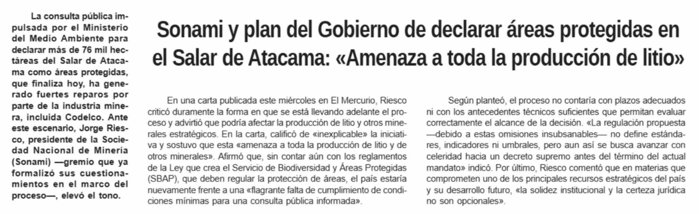 | Título: | Sonami y plan del Gobierno de declarar áreas protegidas en el Salar de Atacama: «Amenaza a toda la producción de litio» |