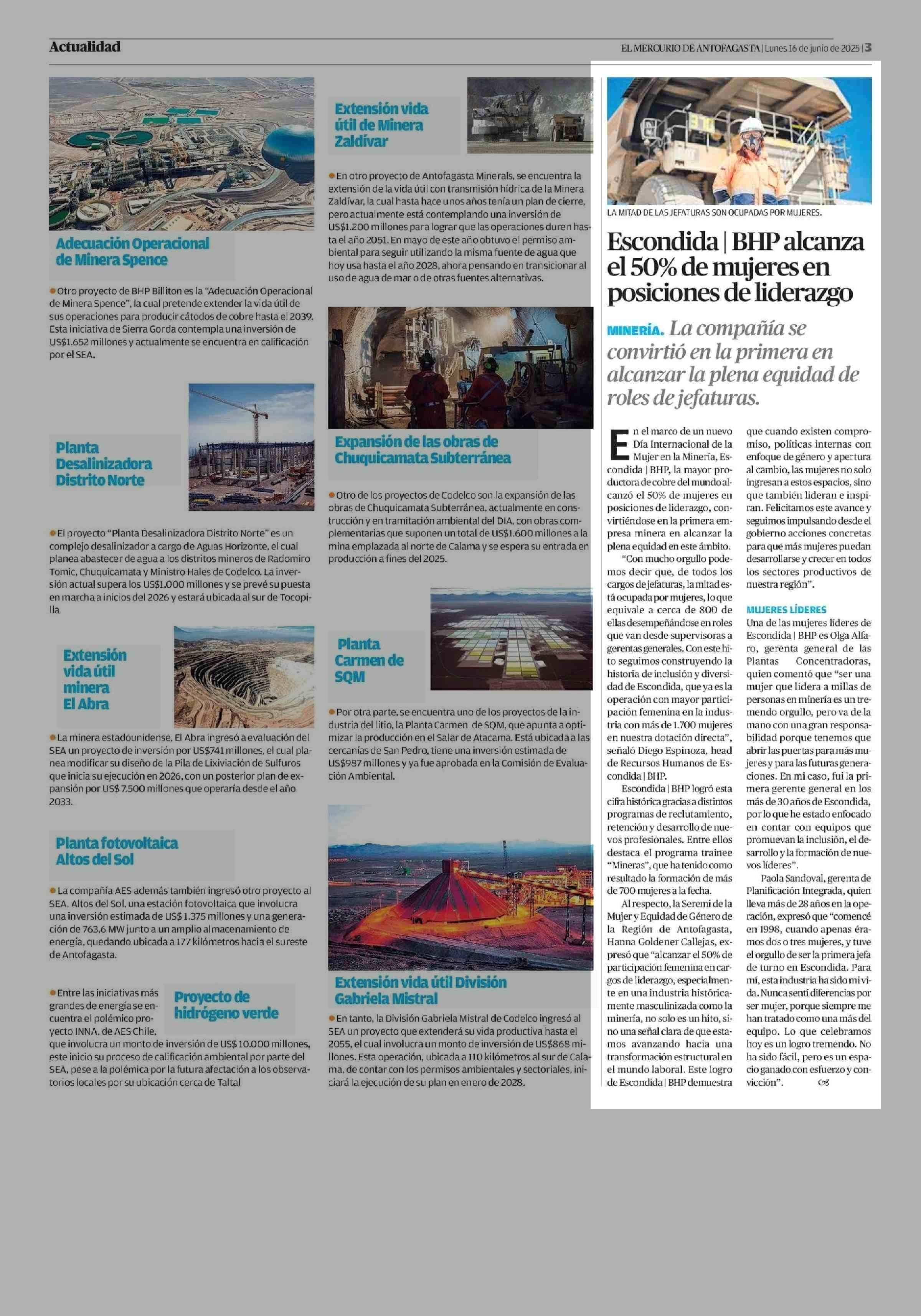 Escondida | BHP alcanza el 50% de mujeres en posiciones de liderazgo 16-06-2025 El Mercurio de Antofagasta |