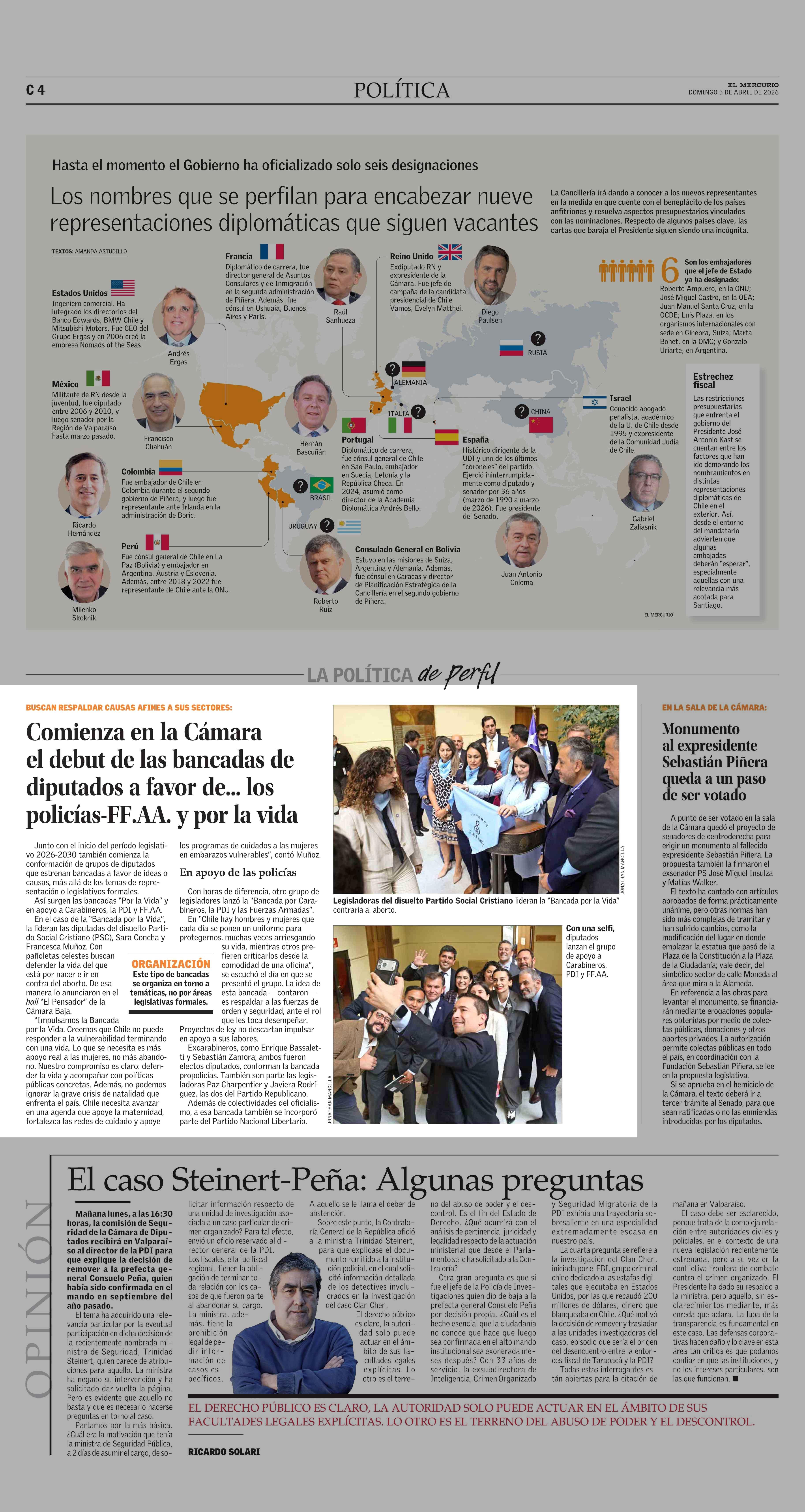 Comienza en la Cámara el debut de las bancadas de diputados a favor de... los policías-FF.AA. y por la vida 05-04-2026 El Mercurio |