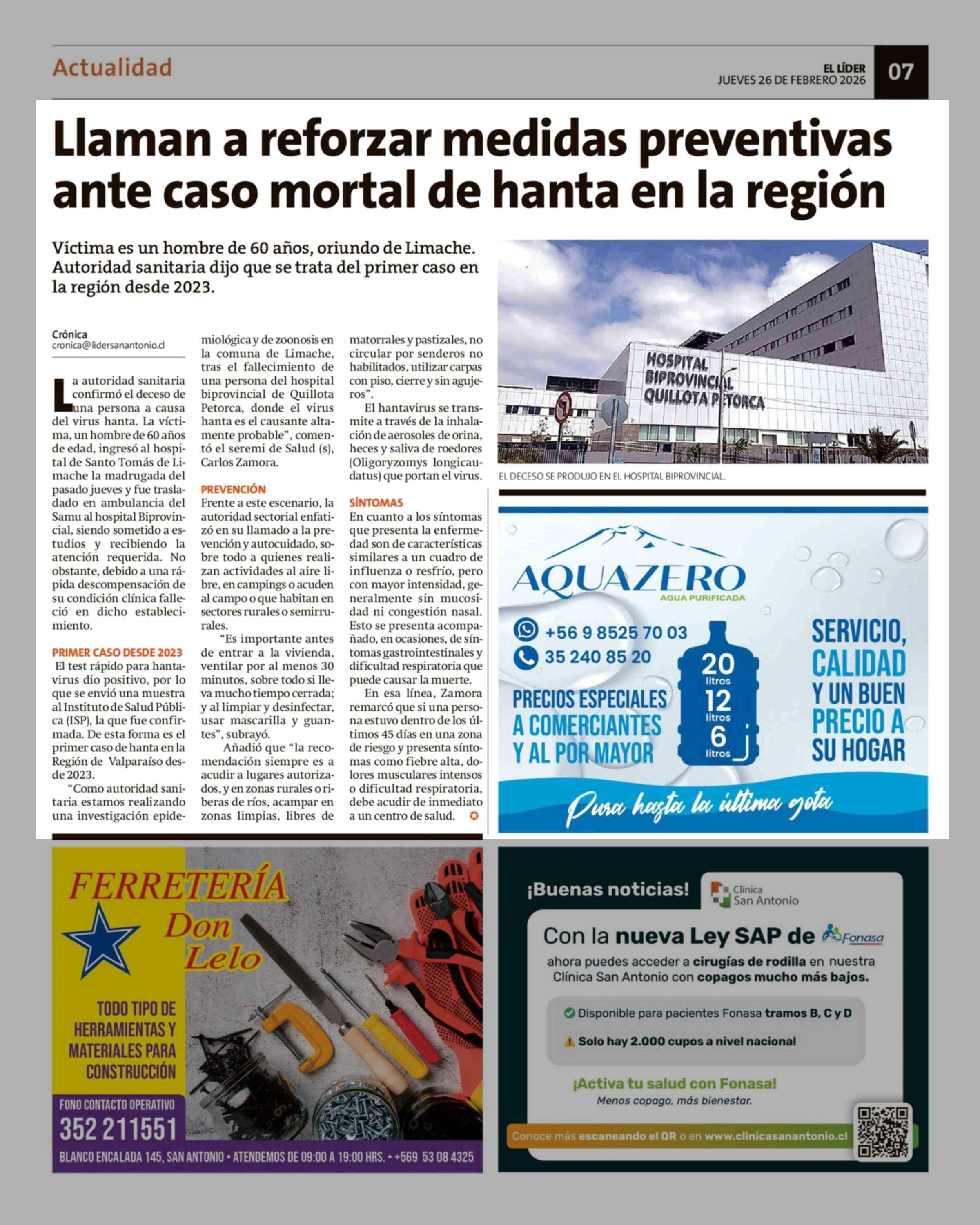 Llaman a reforzar medidas preventivas ante caso mortal de hanta en la región 26-02-2026 El Líder |