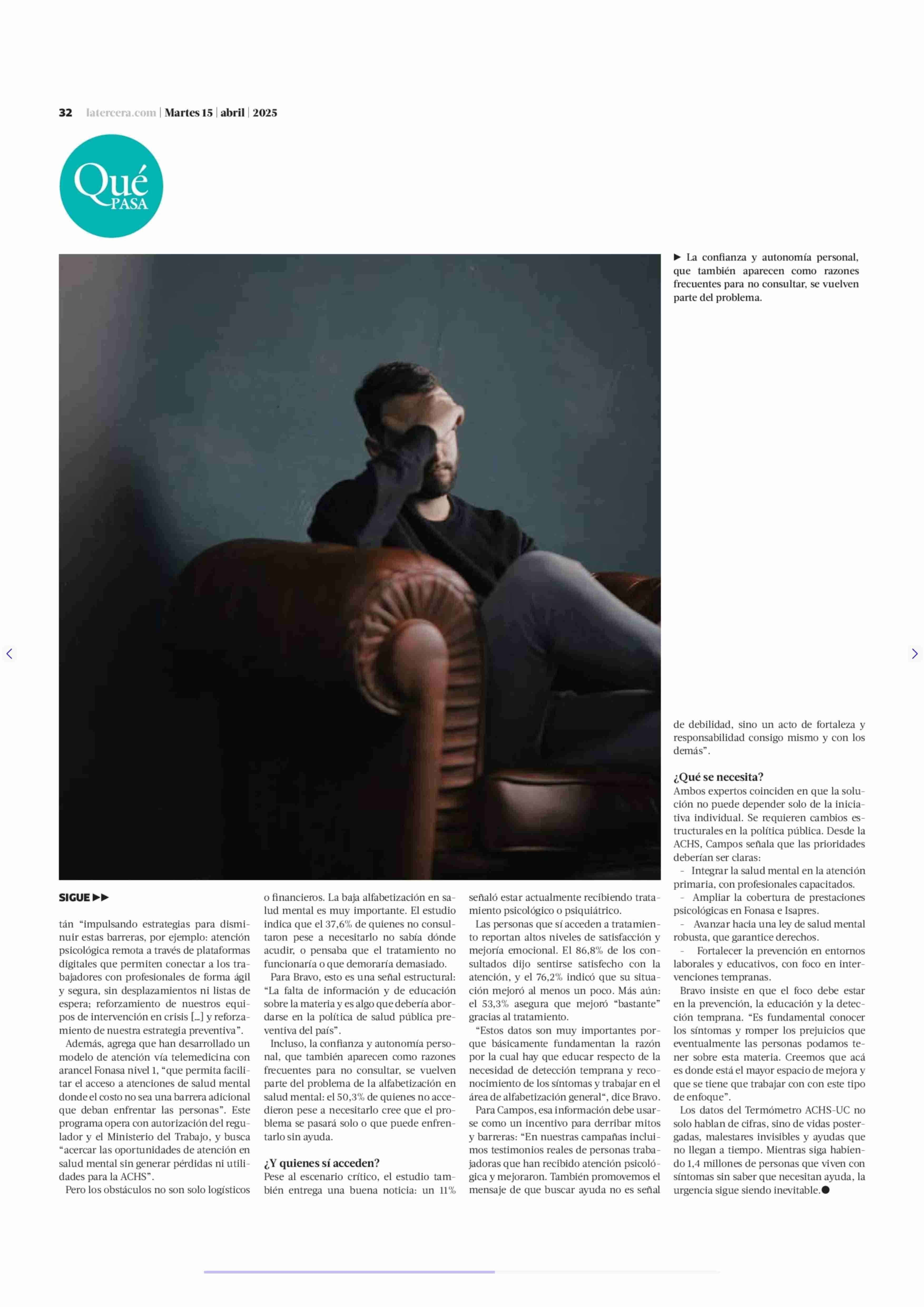 1,4 millones de chilenos creen tener problemas de salud mental, pero no consultan a un especialista 15-04-2025 La Tercera |