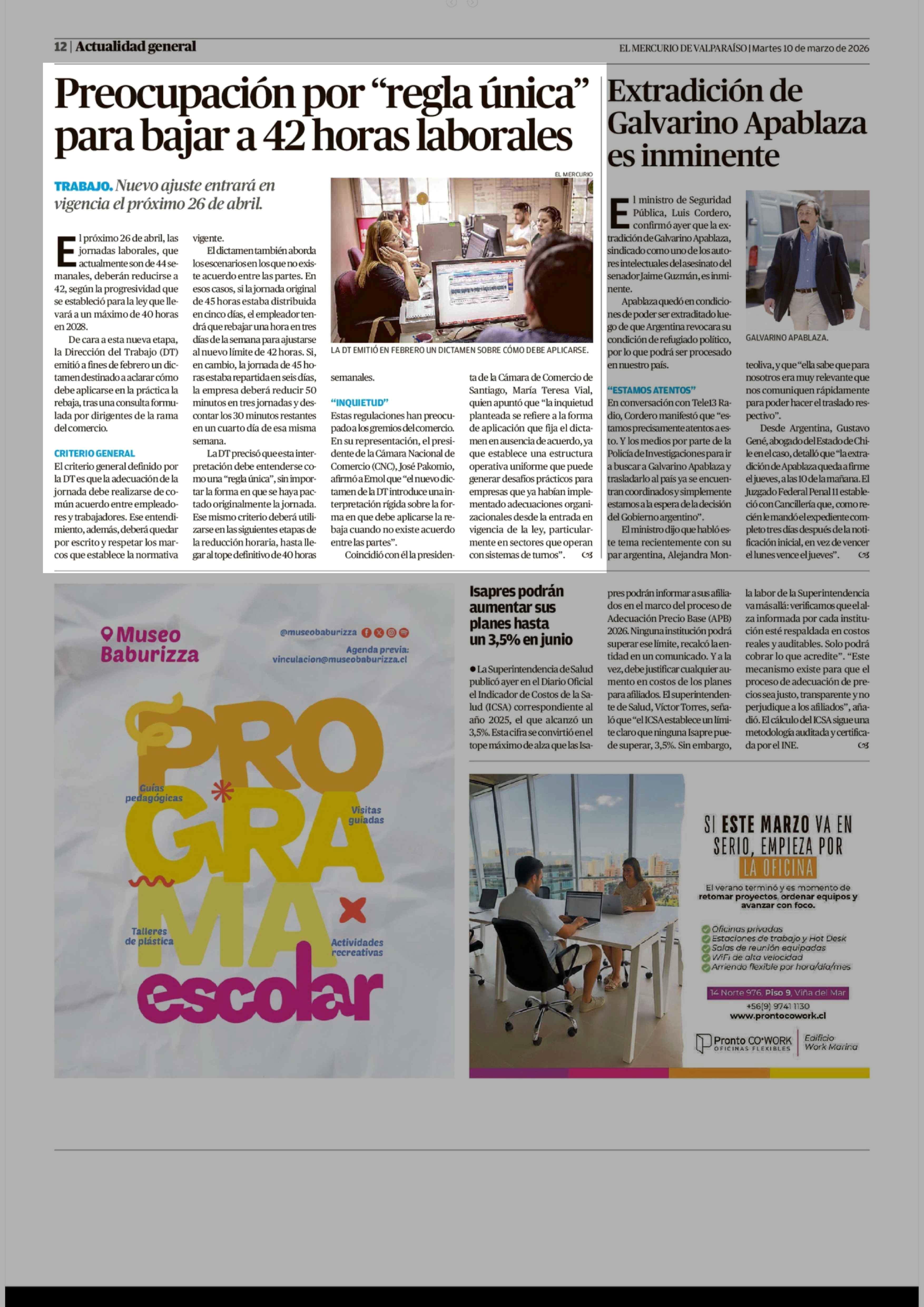 Preocupación por "regla única" para bajar a 42 horas laborales 10-03-2026 El Mercurio de Valparaíso |