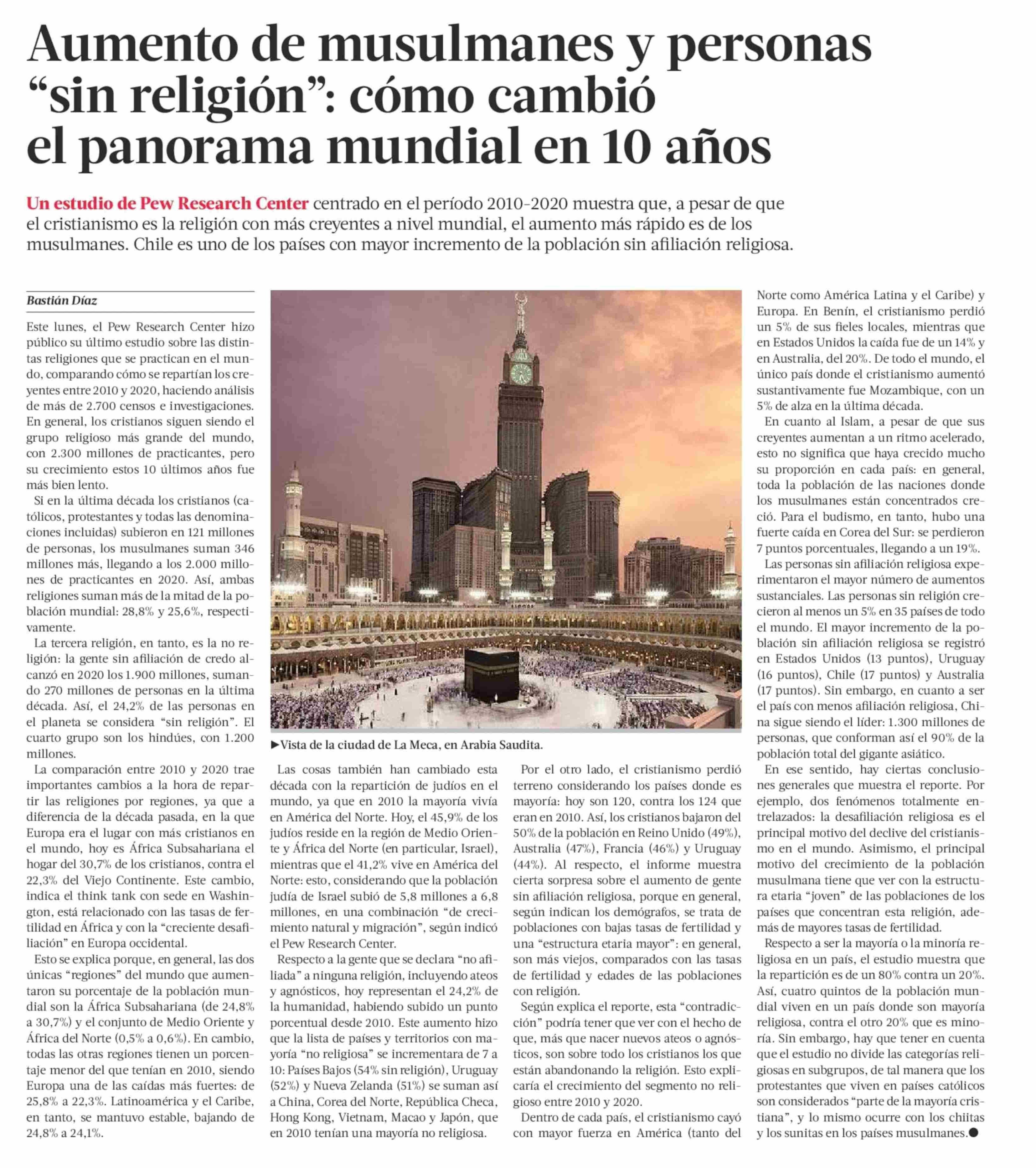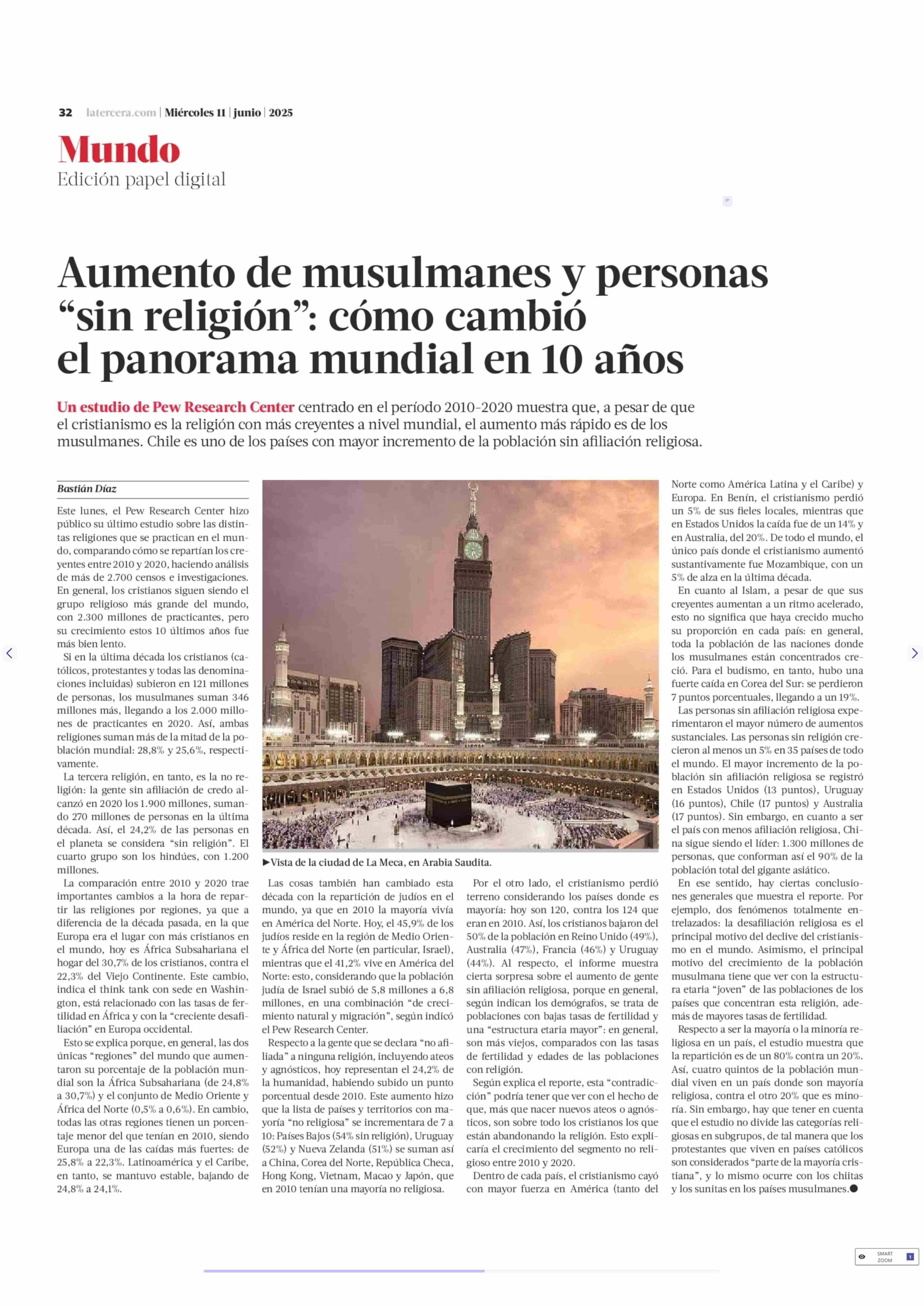 Aumento de musulmanes y personas “sin religión”: cómo cambió el panorama mundial en 10 años 11-06-2025 La Tercera |