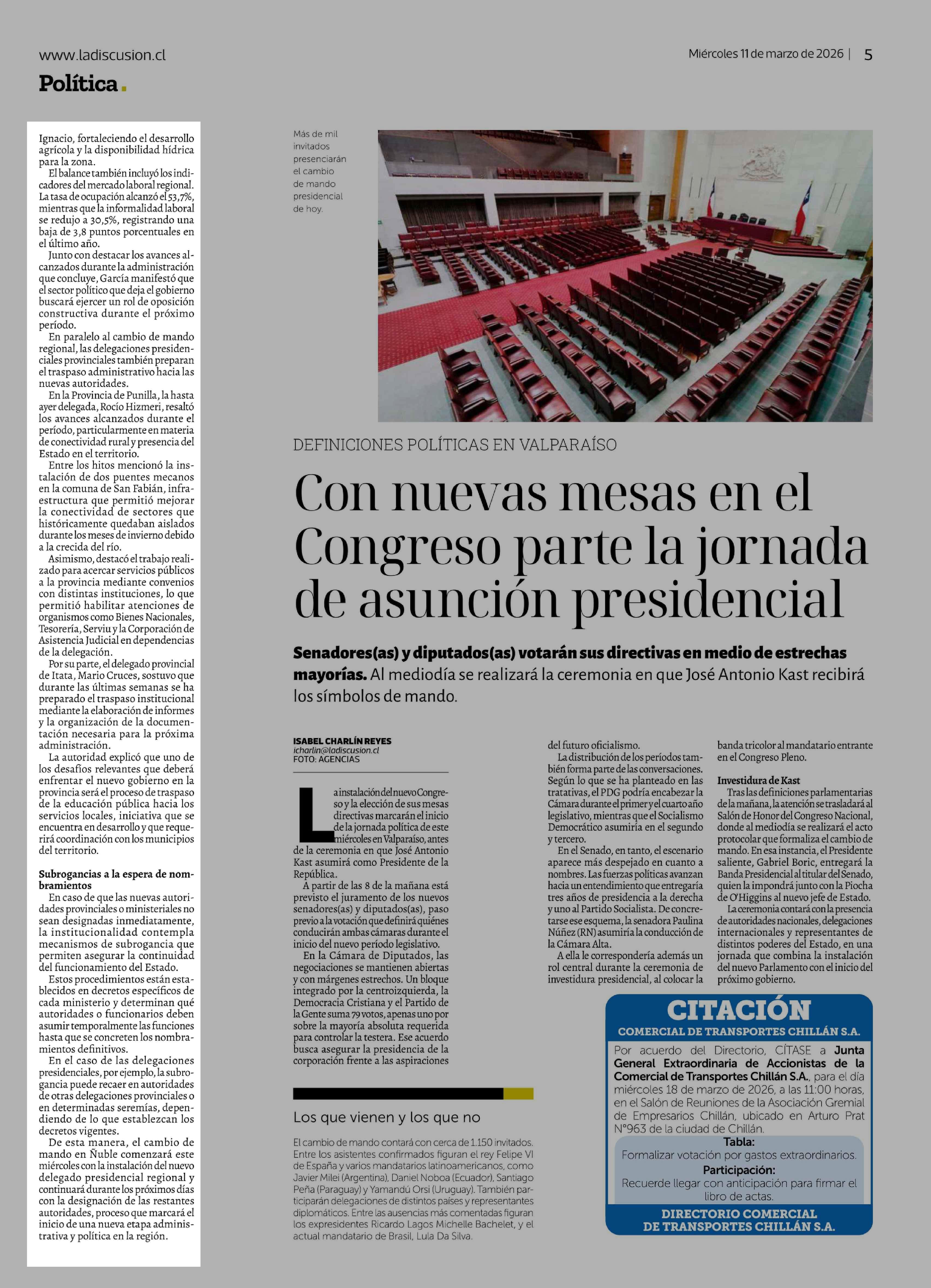 Ñuble inicia nueva etapa política con autoridades aún por definir 11-03-2026 La Discusión |