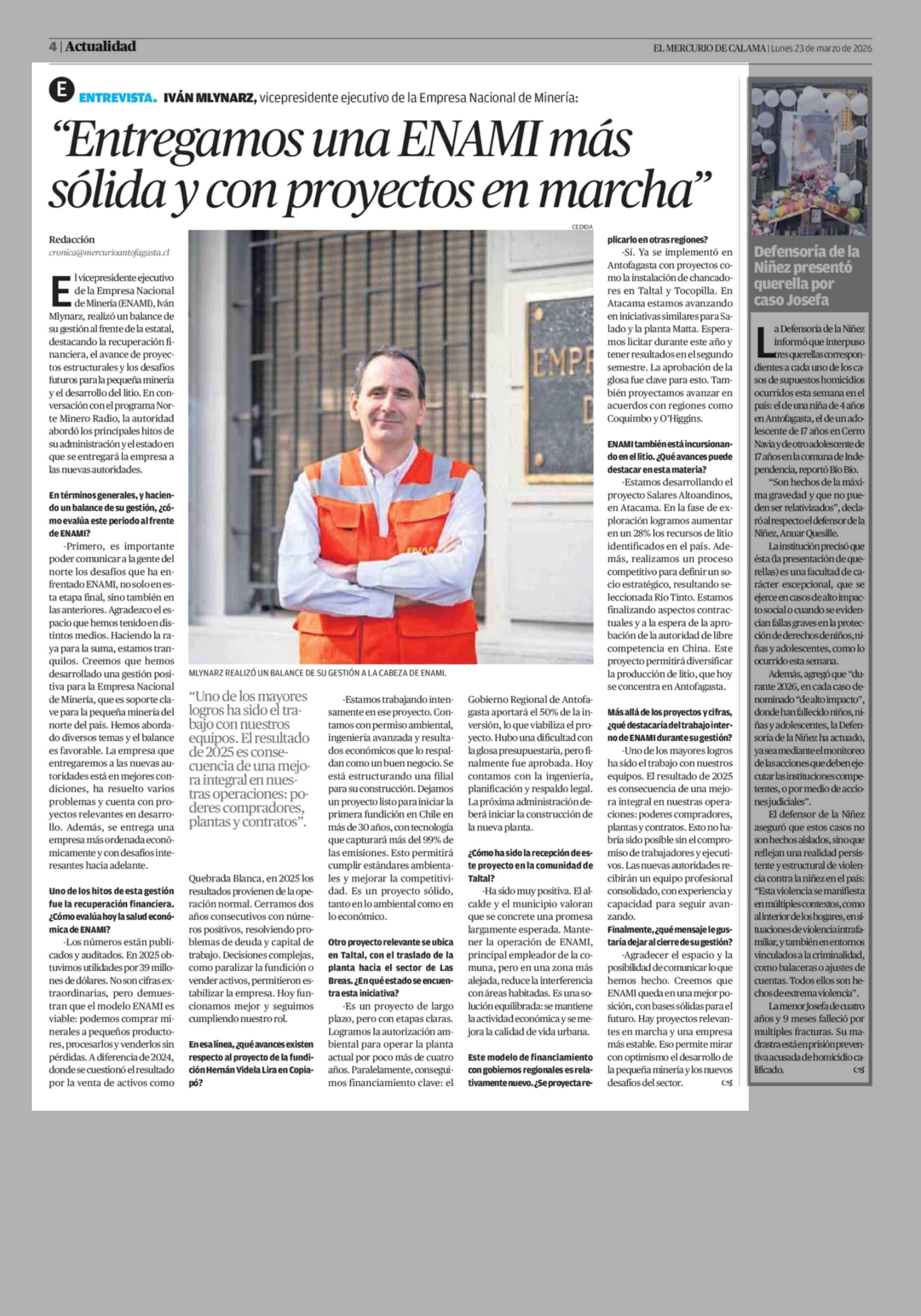 "Entregamos una ENAMI más sólida y con proyectos en marcha" 23-03-2026 El Mercurio de Calama |