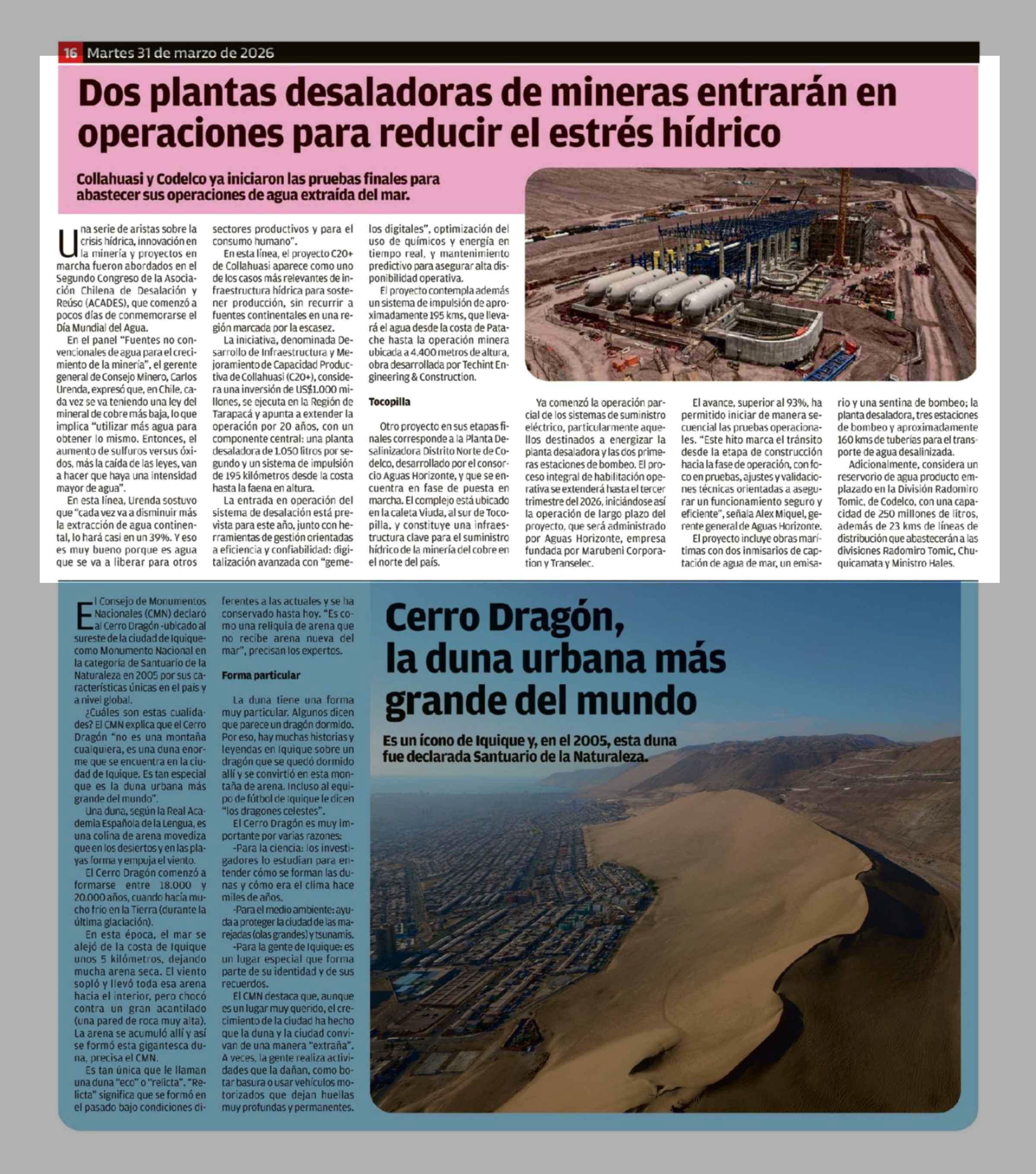 Título: Dos plantas desaladoras de mineras entrarán en operaciones para reducir el estrés hídrico