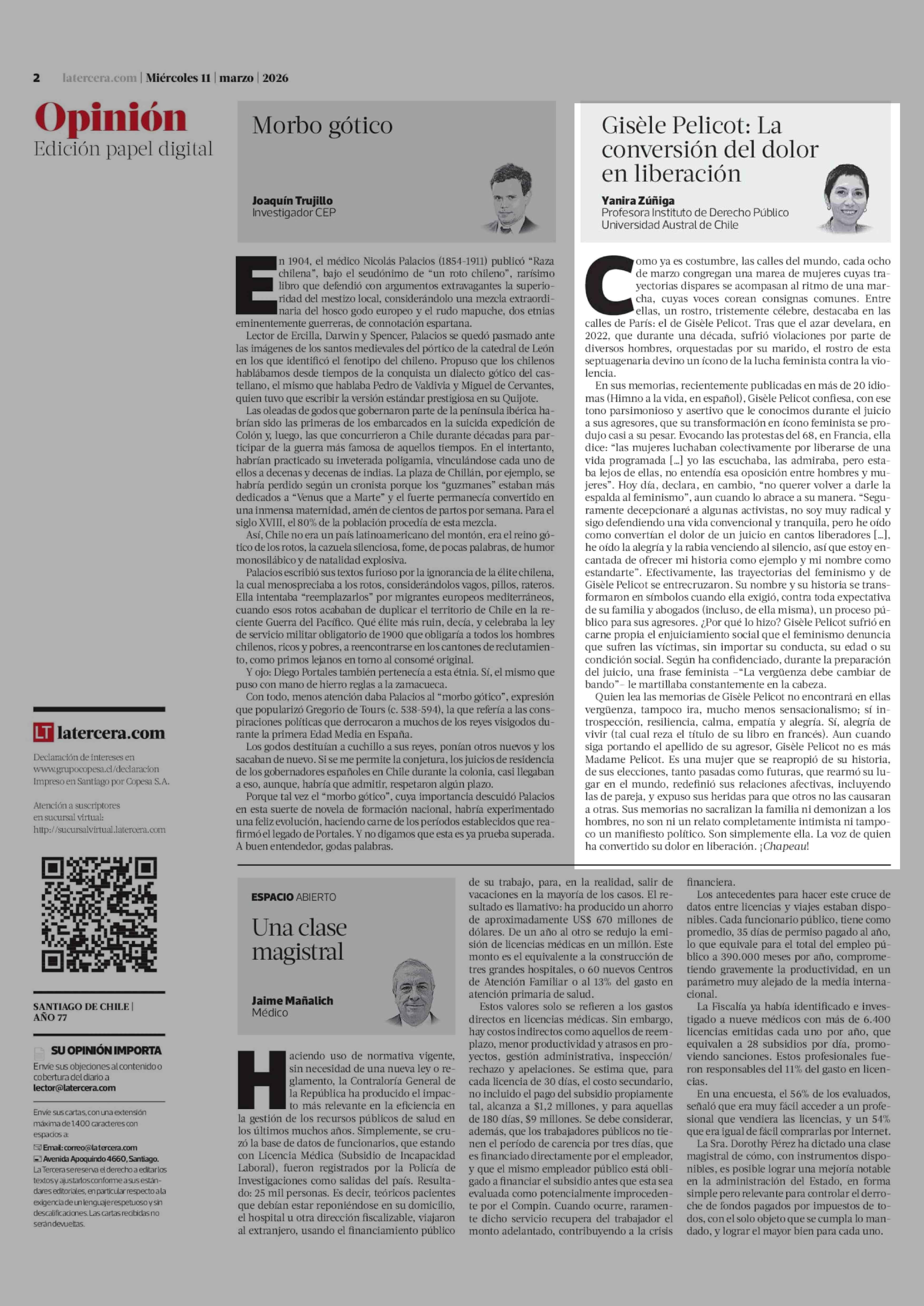 Columnas de Opinión: Gisèle Pelicot: La conversión del dolor en liberación 11-03-2026 La Tercera |