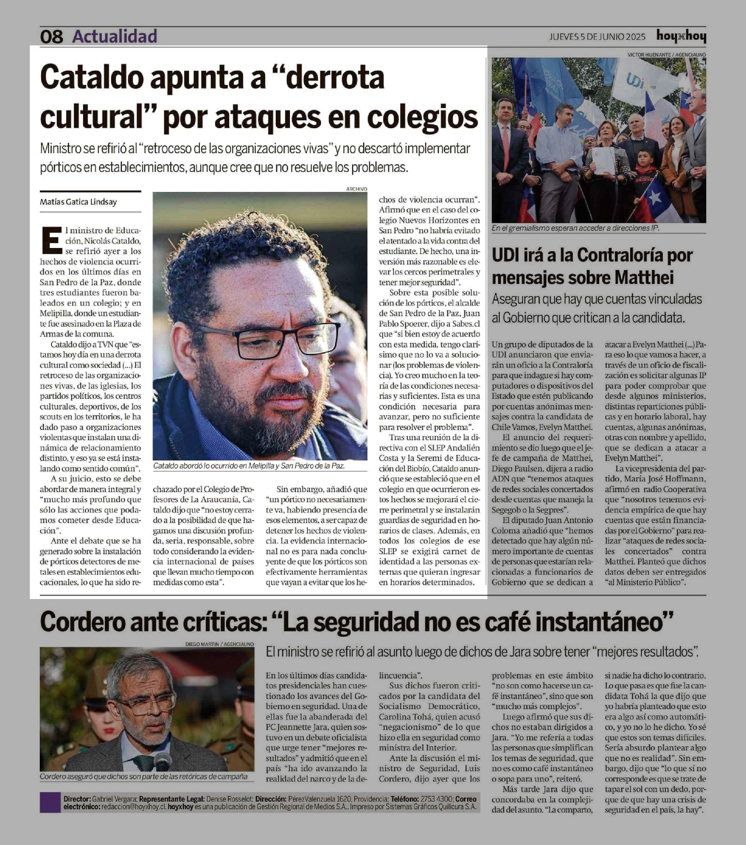 Cataldo apunta a “derrota cultural” por ataques en colegios 05-06-2025 Hoy x Hoy Antofagasta |