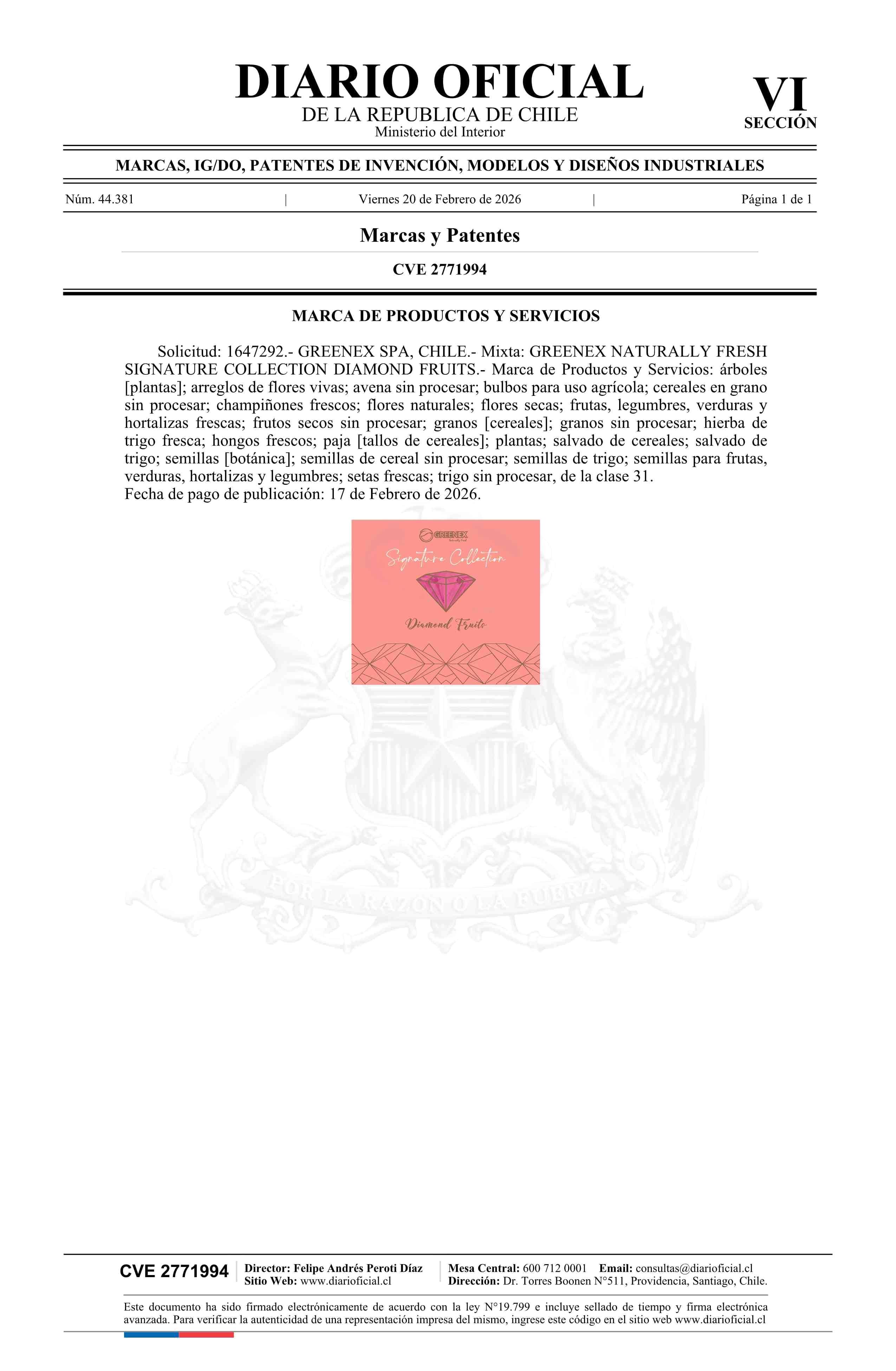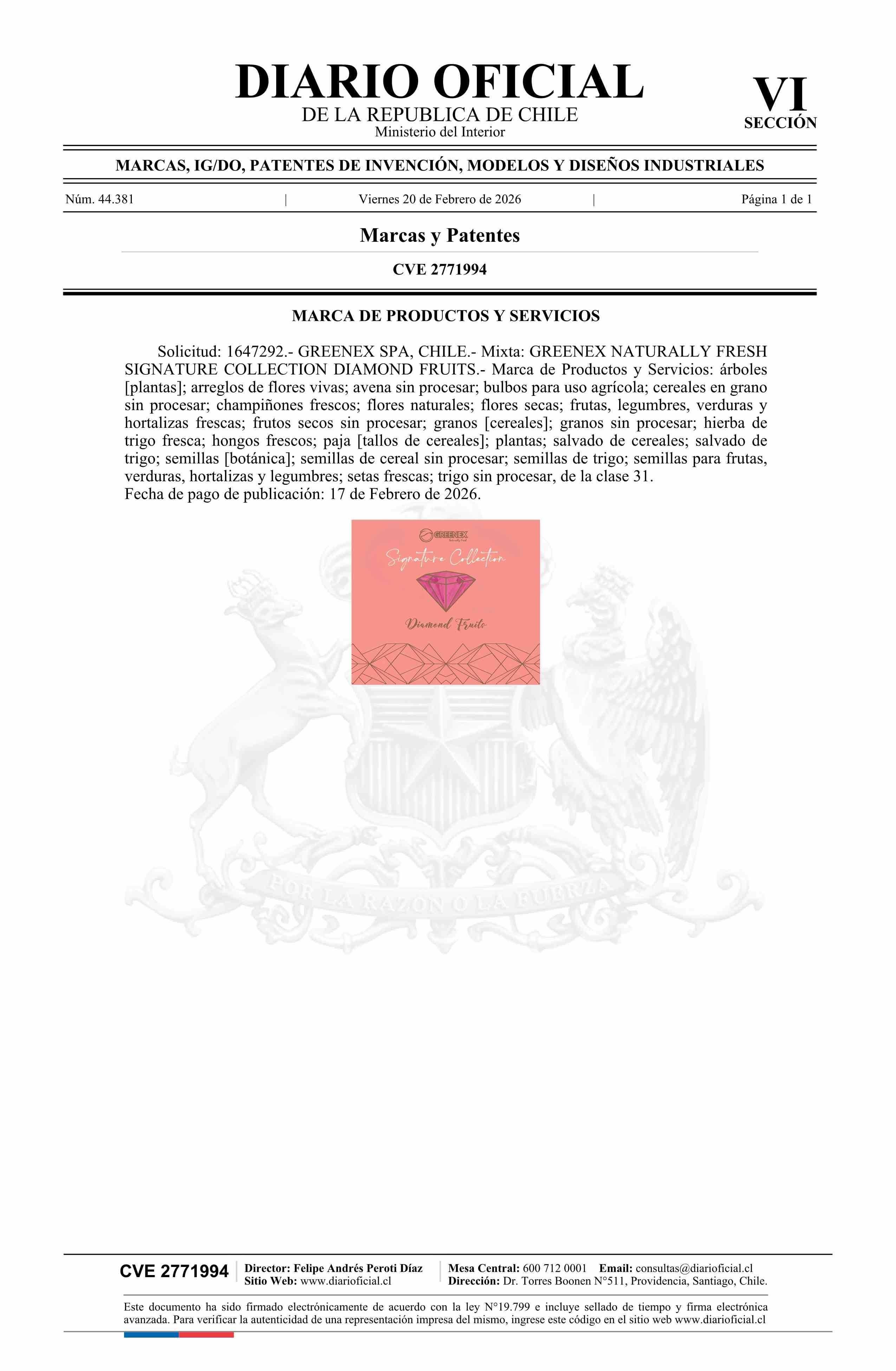Solicitud número 1647292.- GREENEX NATURALLY FRESH SIGNATURE COLLECTION DIAMOND FRUITS 20-02-2026 Diario Oficial Edición Electrónica |