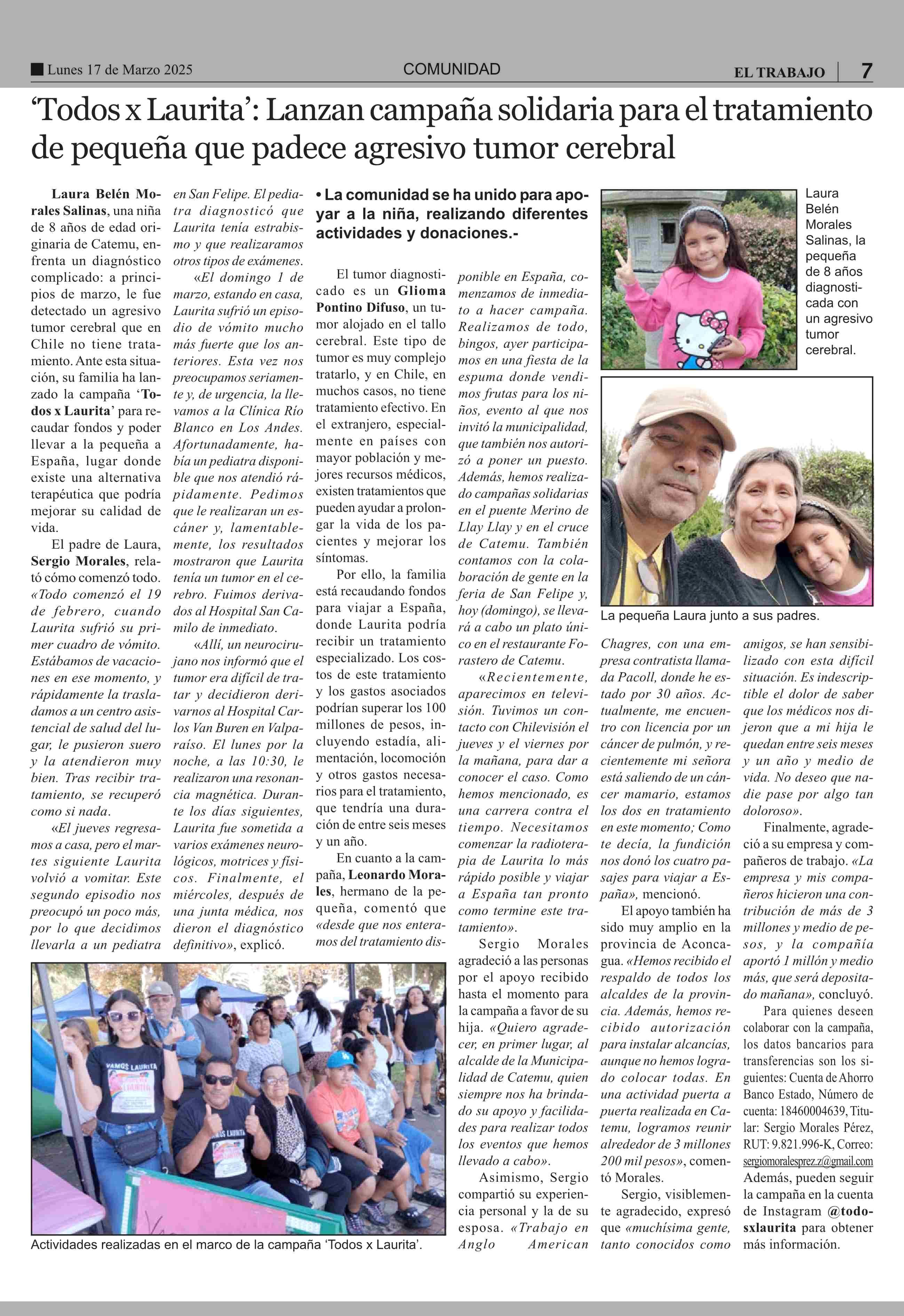 `Todos x Laurita': Lanzan campaña solidaria para el tratamiento de pequeña que padece agresivo tumor cerebral 17-03-2025 El Trabajo |