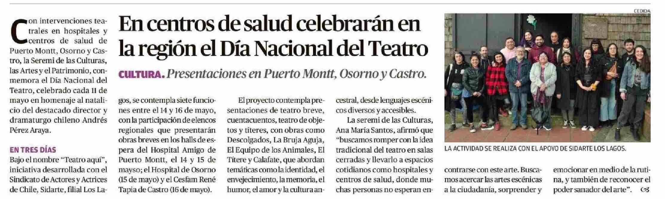 En centros de salud celebrarán en la región el Día Nacional del Teatro 13-05-2025 El Llanquihue |