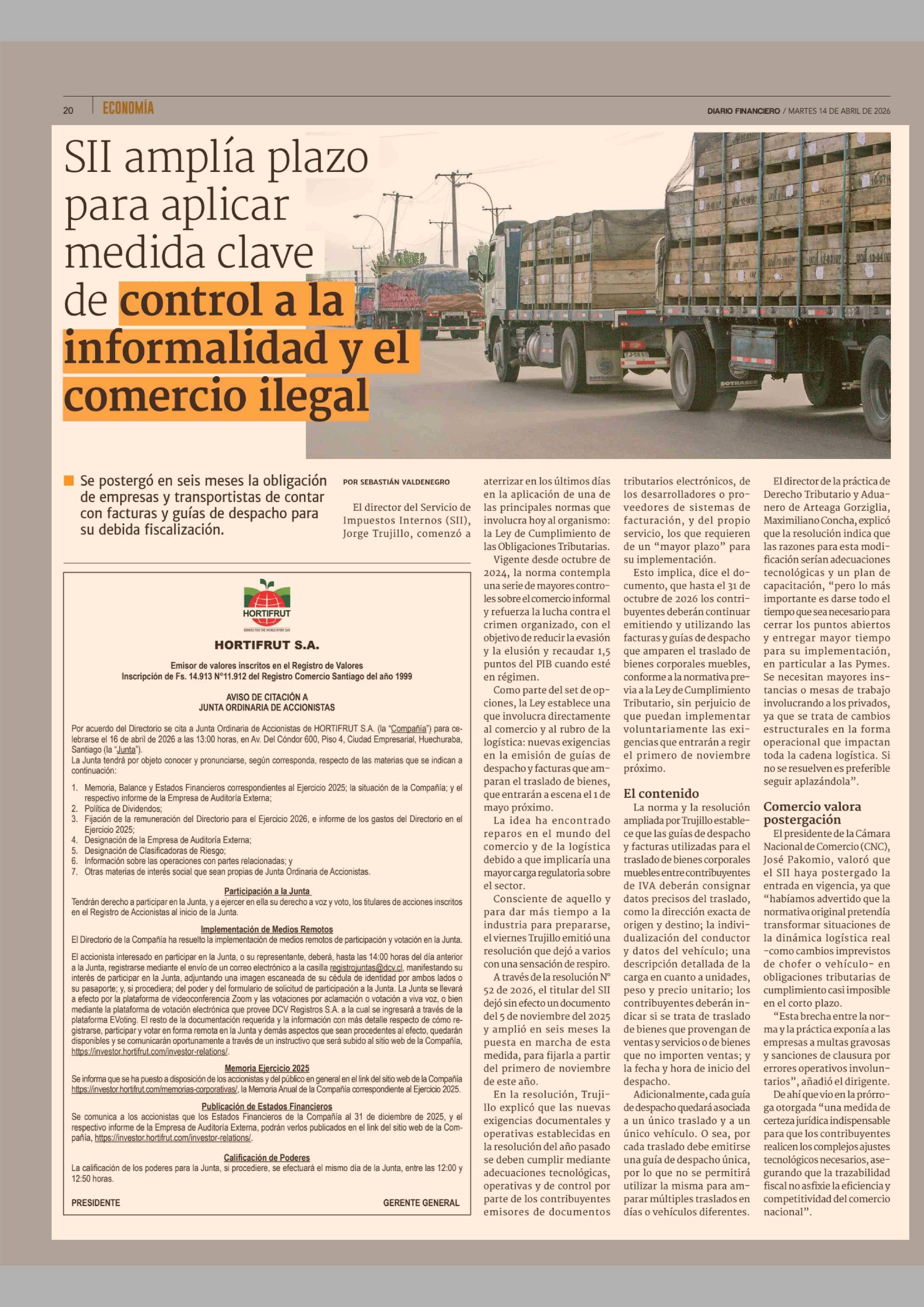 SII amplía plazo para aplicar medida clave de control a la informalidad y el comercio ilegal 14-04-2026 Diario Financiero |