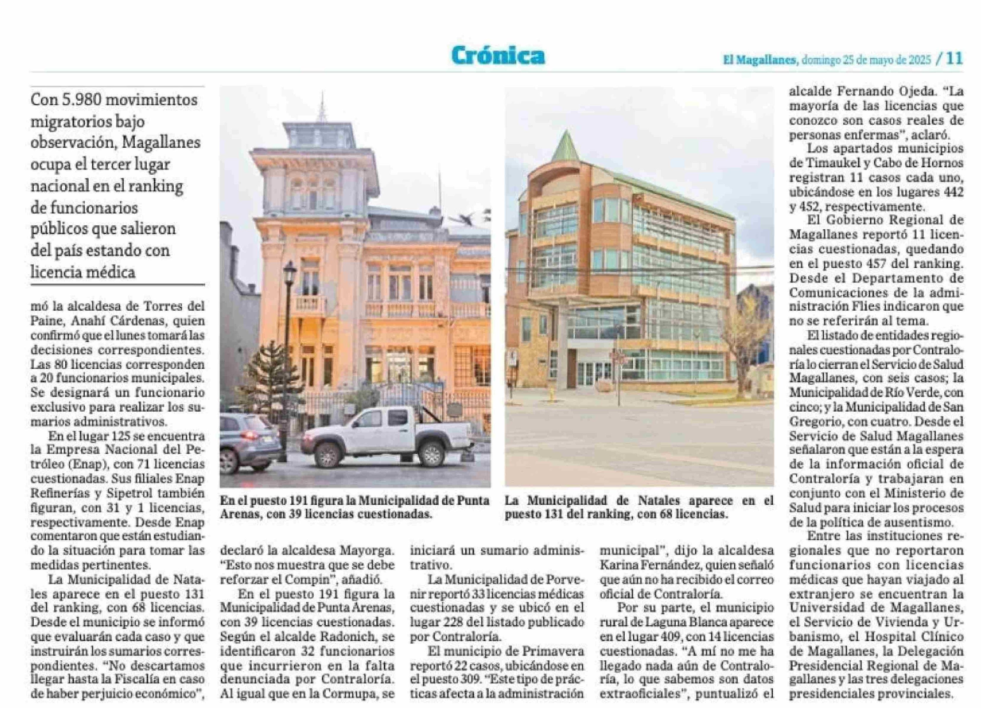18 instituciones de Magallanes bajo la lupa por funcionarios que viajaron al extranjero estando con licencia médica 25-05-2025 El Magallanes |