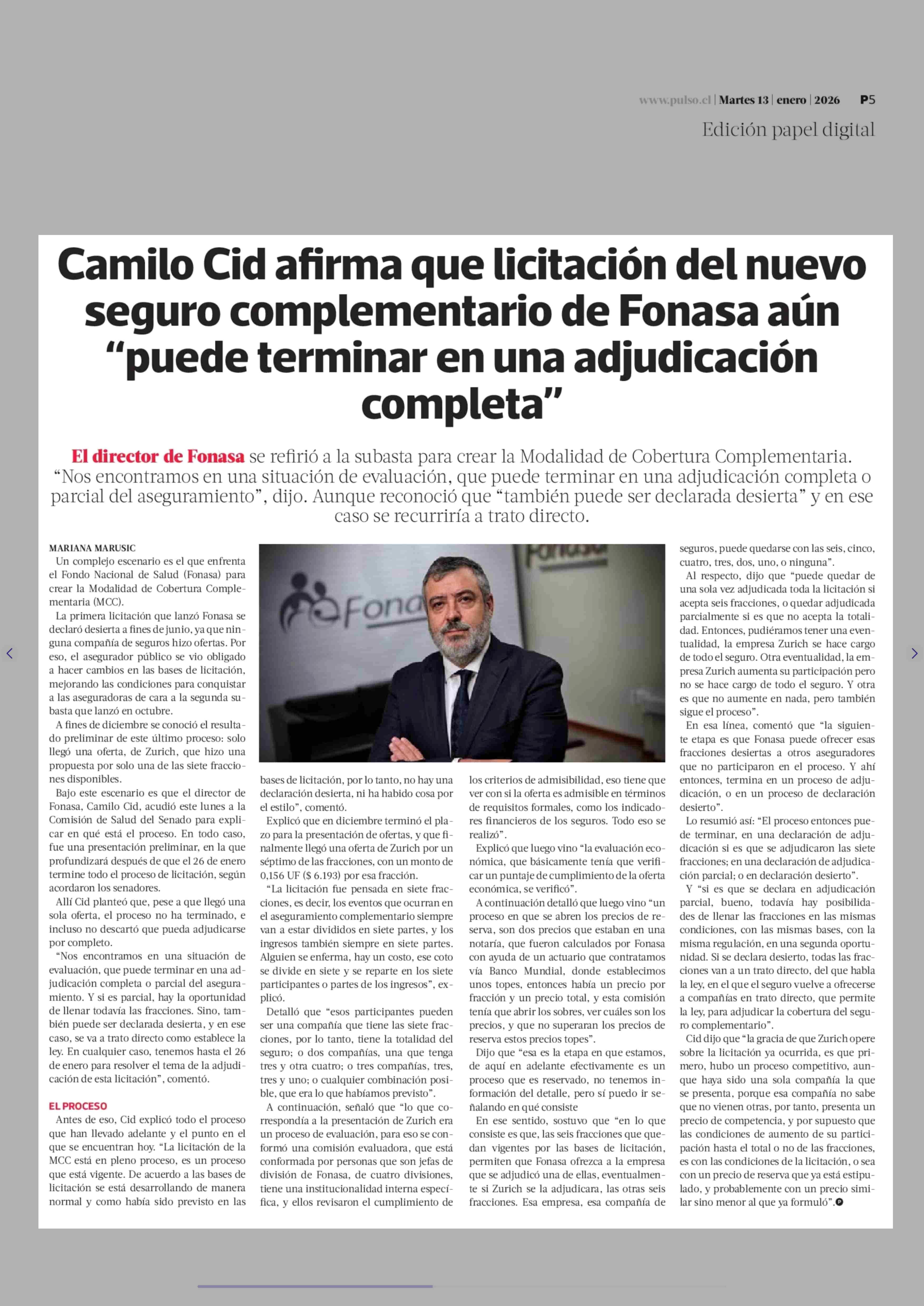 Camilo Cid afirma que licitación del nuevo seguro complementario de Fonasa aún "puede terminar en una adjudicación completa" 13-01-2026 La Tercera |