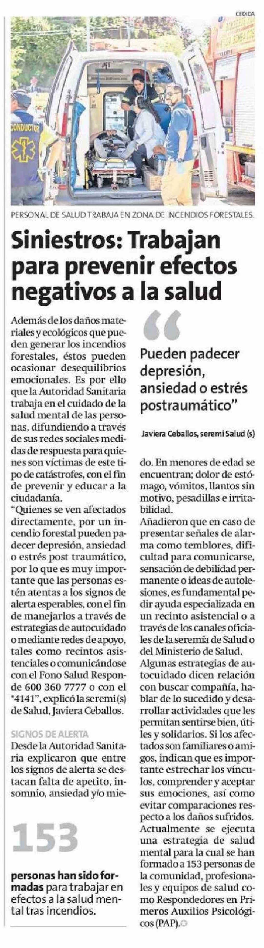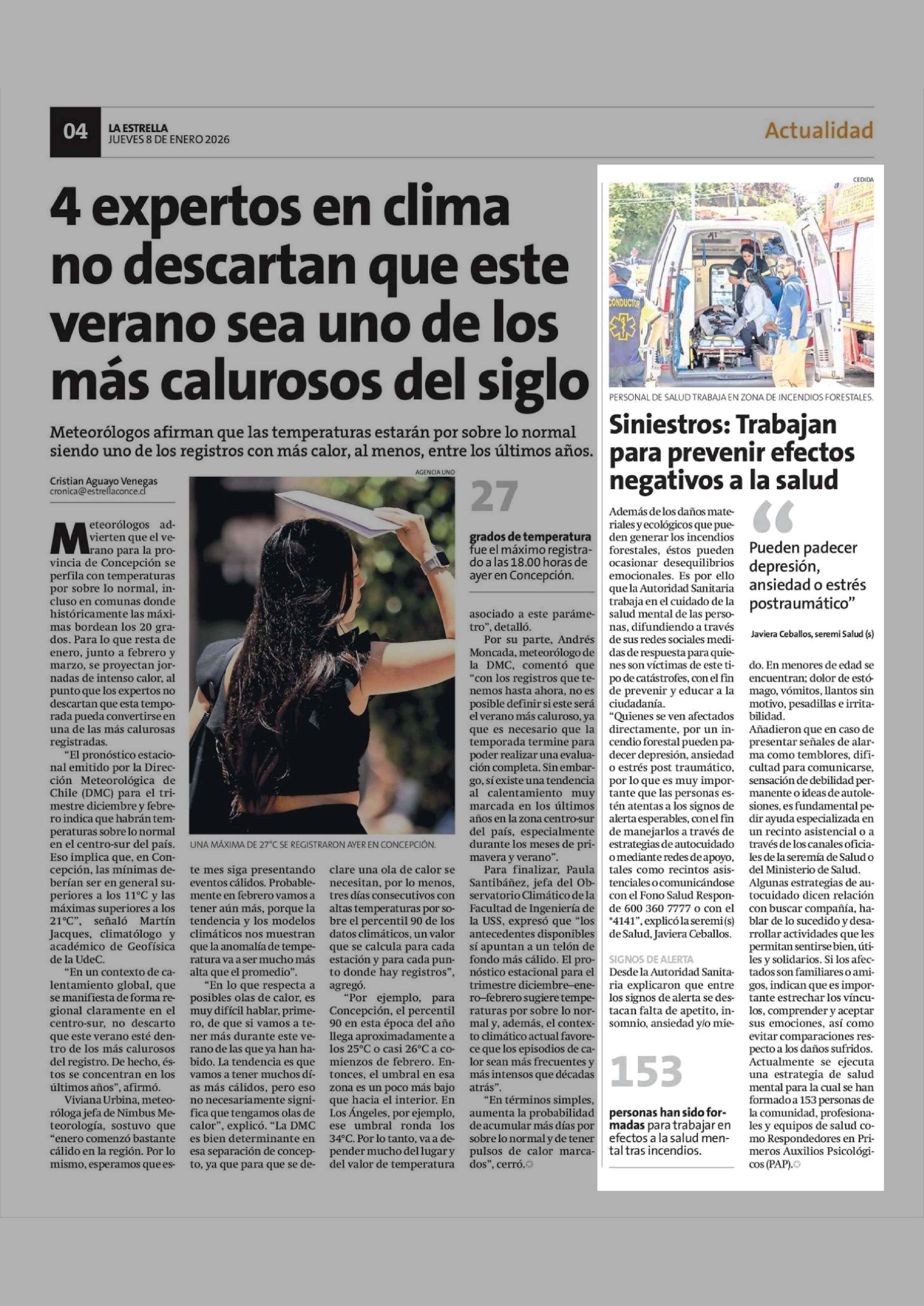 Siniestros: Trabajan para prevenir efectos negativos a la salud 08-01-2026 La Estrella de Concepción |