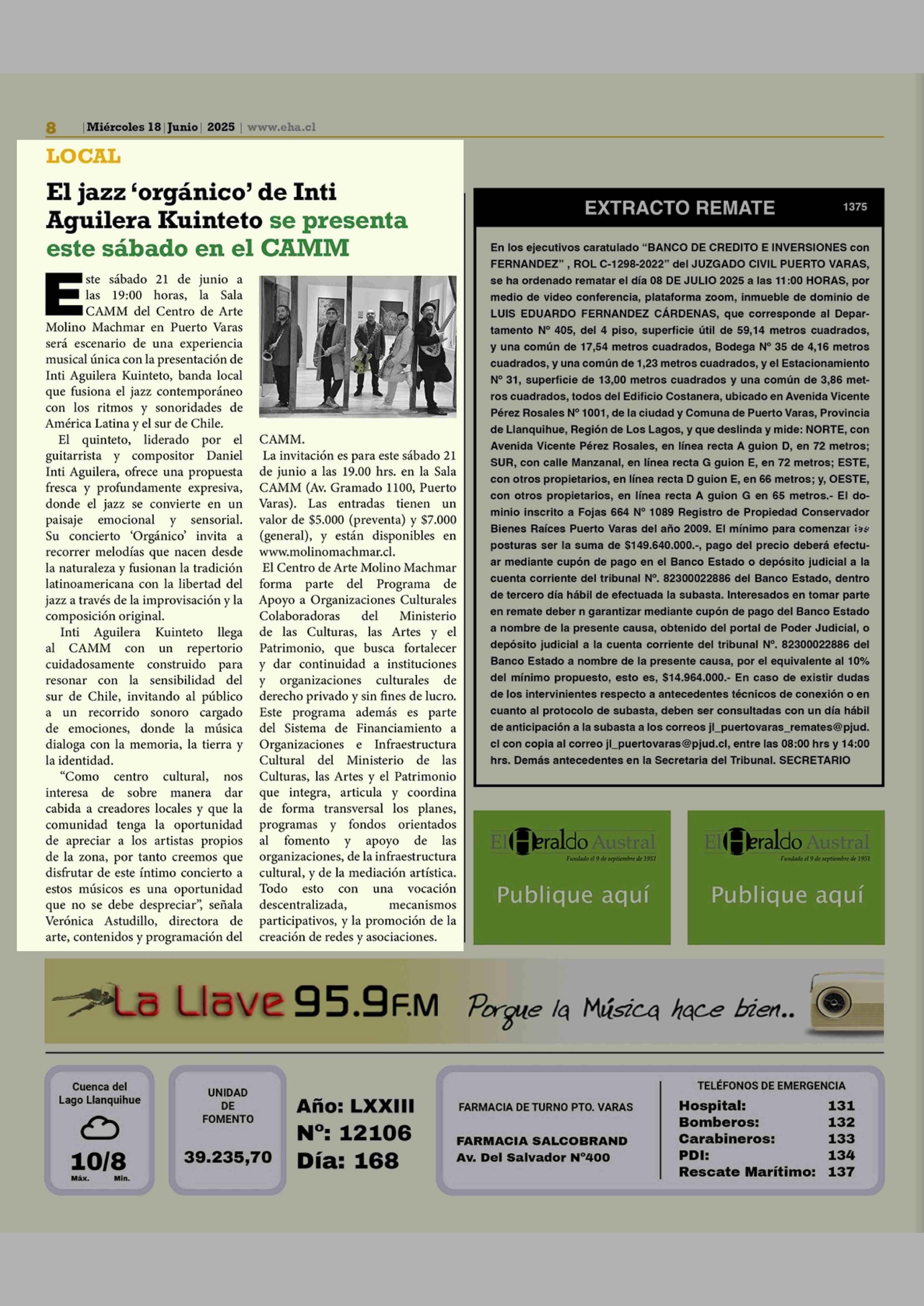 El jazz “orgánico” de Inti Aguilera Kuinteto se presenta este sábado en el CAVMIM 18-06-2025 El Heraldo Austral |