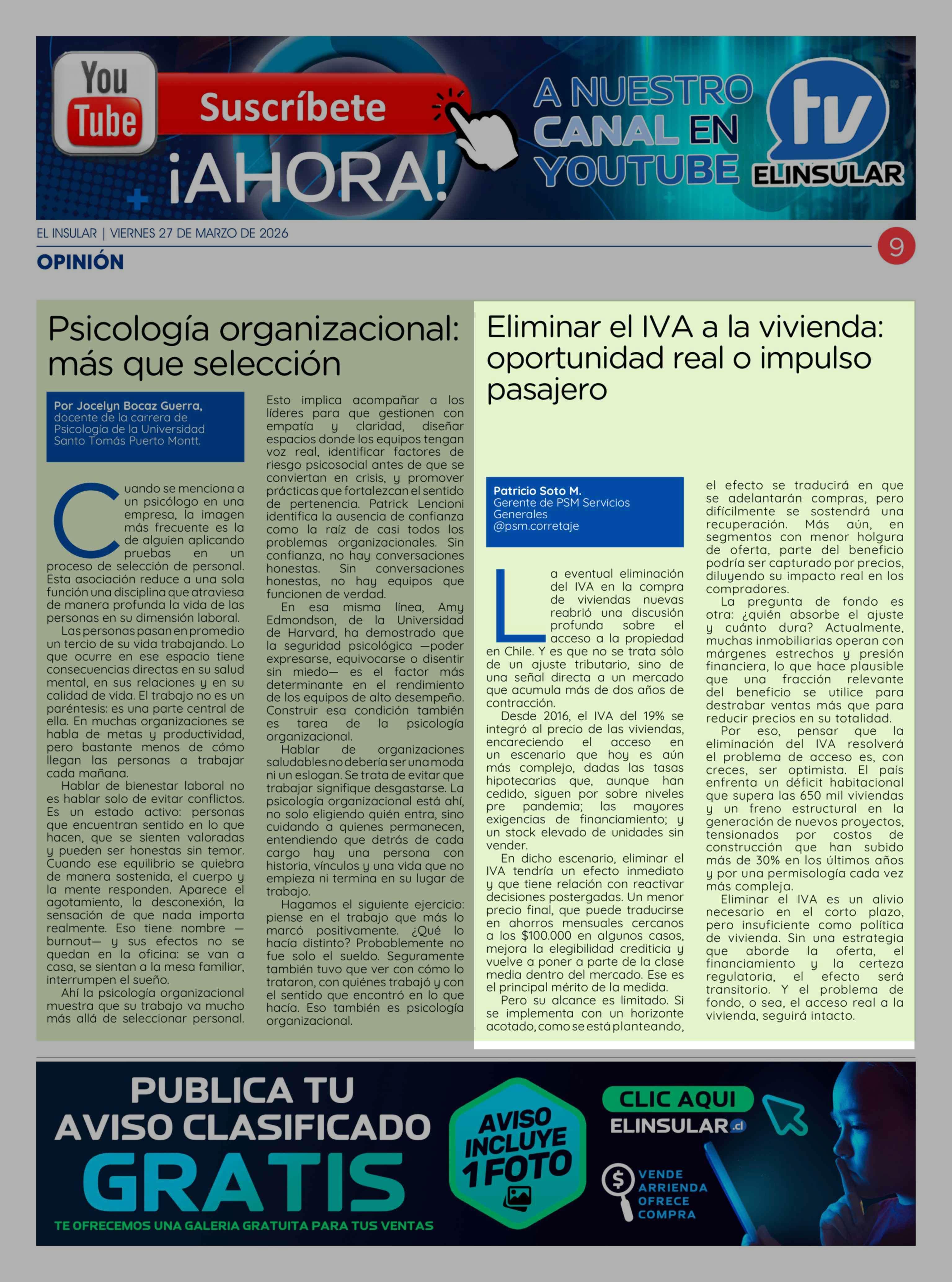 Columnas de Opinión: Eliminar el IVA a la vivienda: oportunidad real o impulso pasajero 27-03-2026 El Insular |