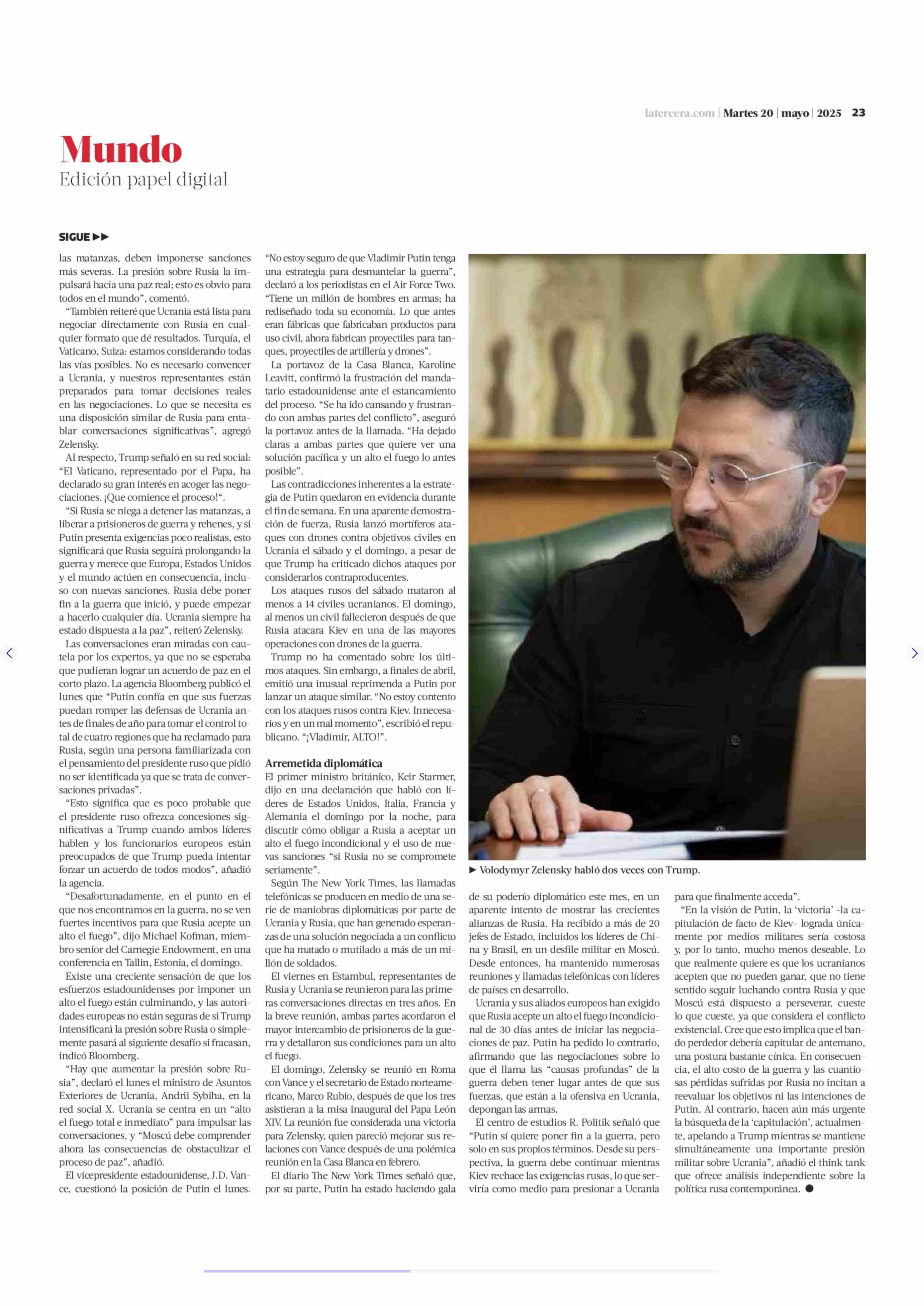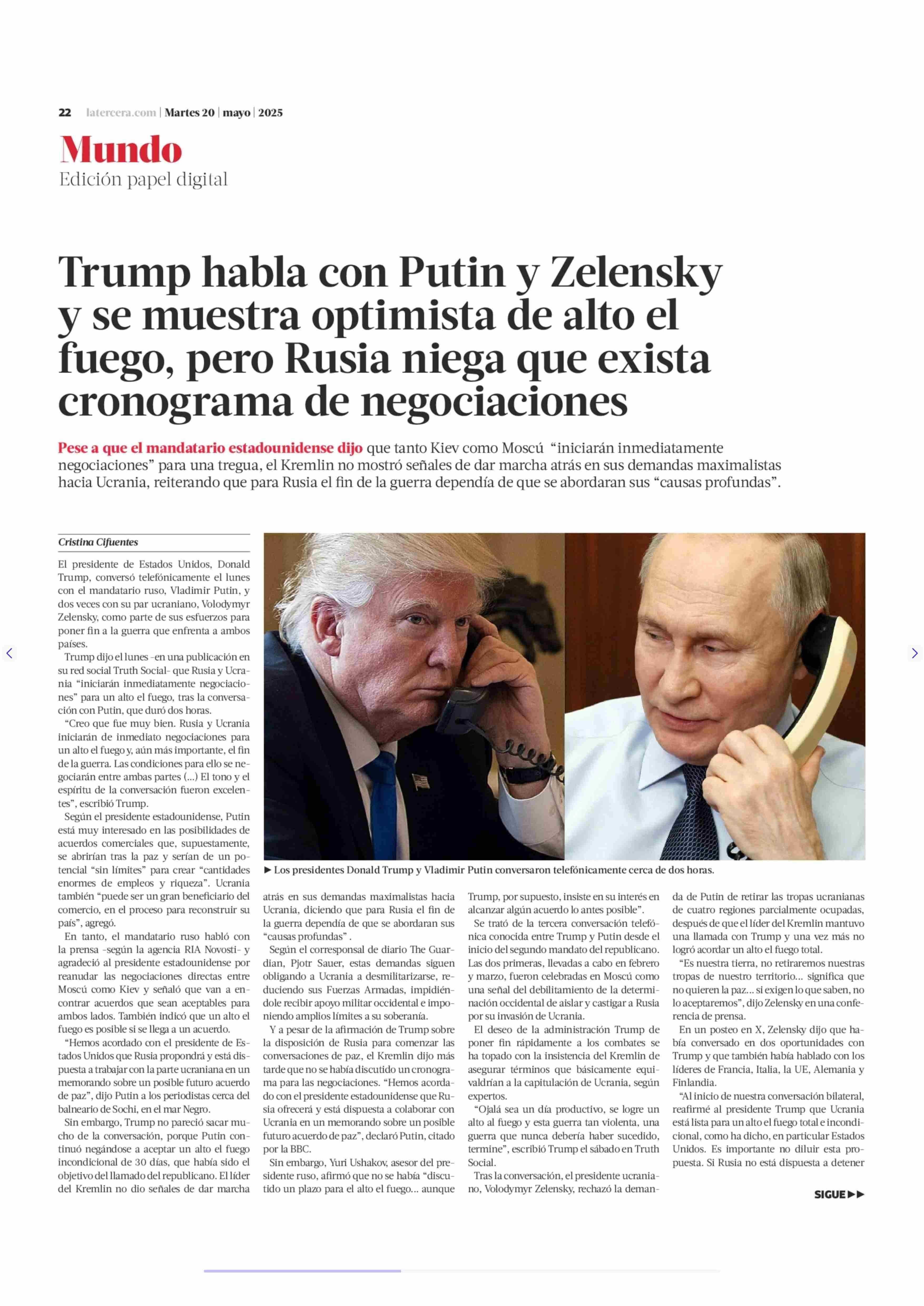 Trump habla con Putin y Zelensky y se muestra optimista de alto el fuego, pero Rusia niega que exista cronograma de negociaciones 20-05-2025 La Tercera |