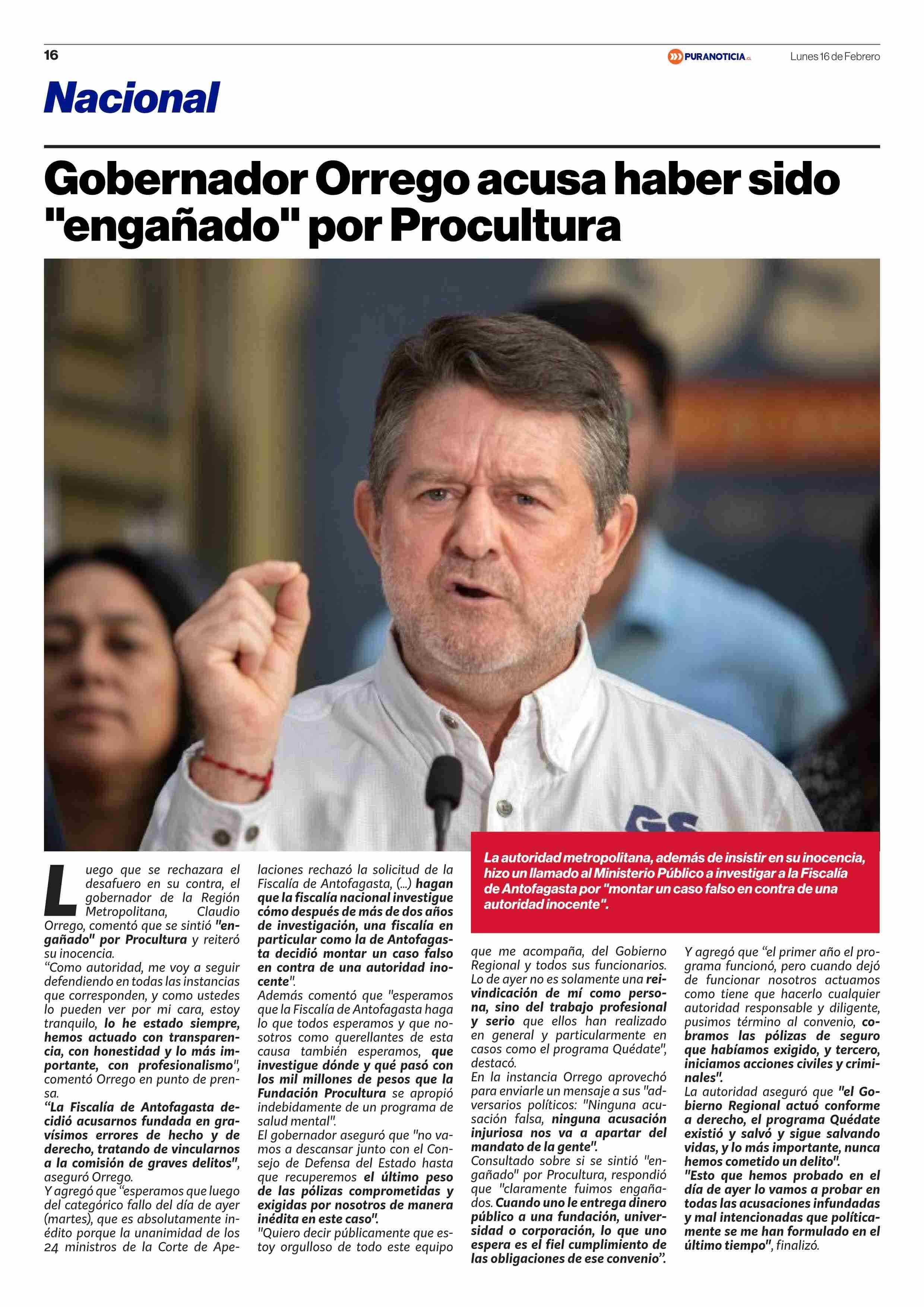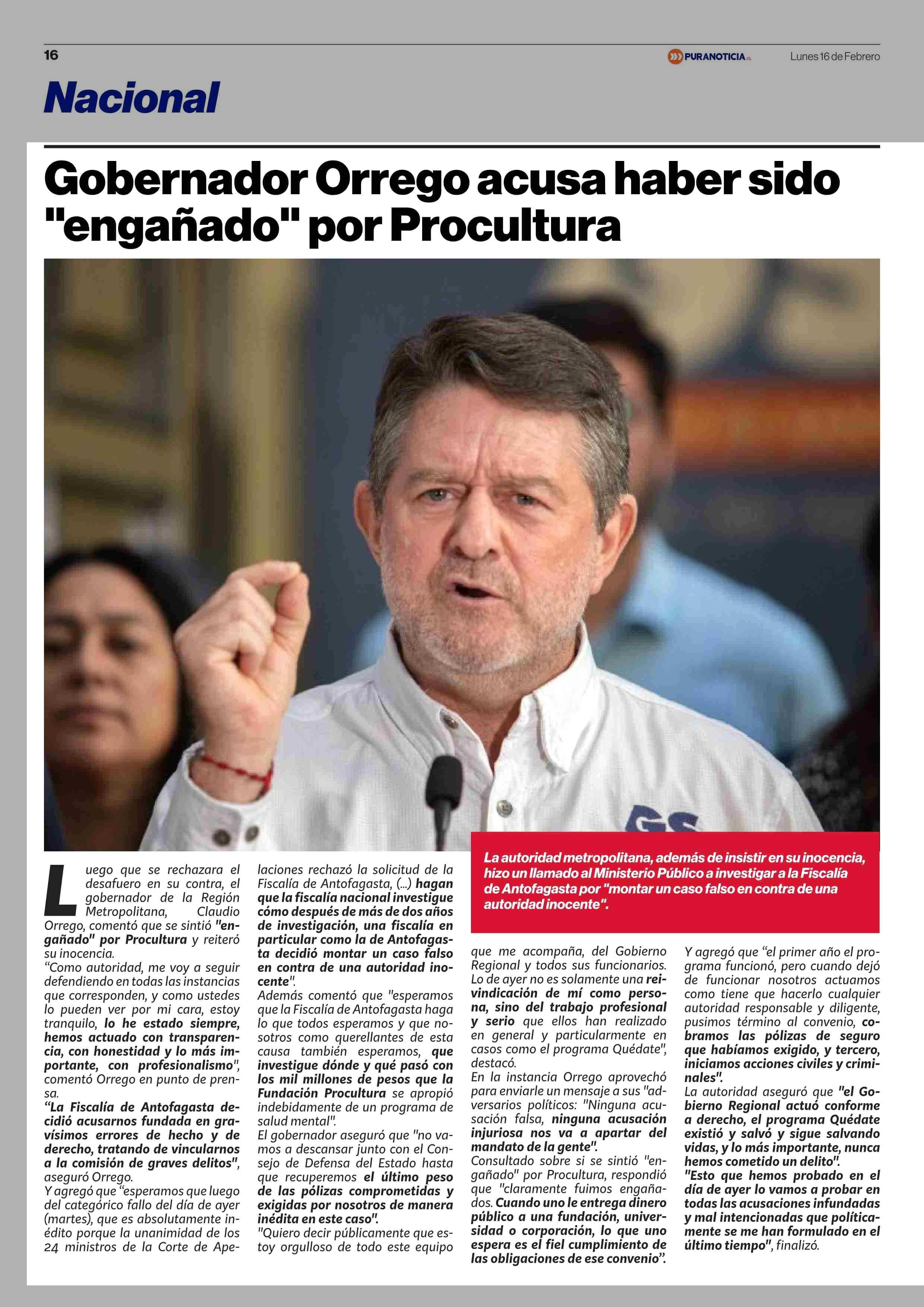 Gobernador Orrego acusa haber sido “engañado” por Procultura 18-02-2026 Puranoticia.cl |
