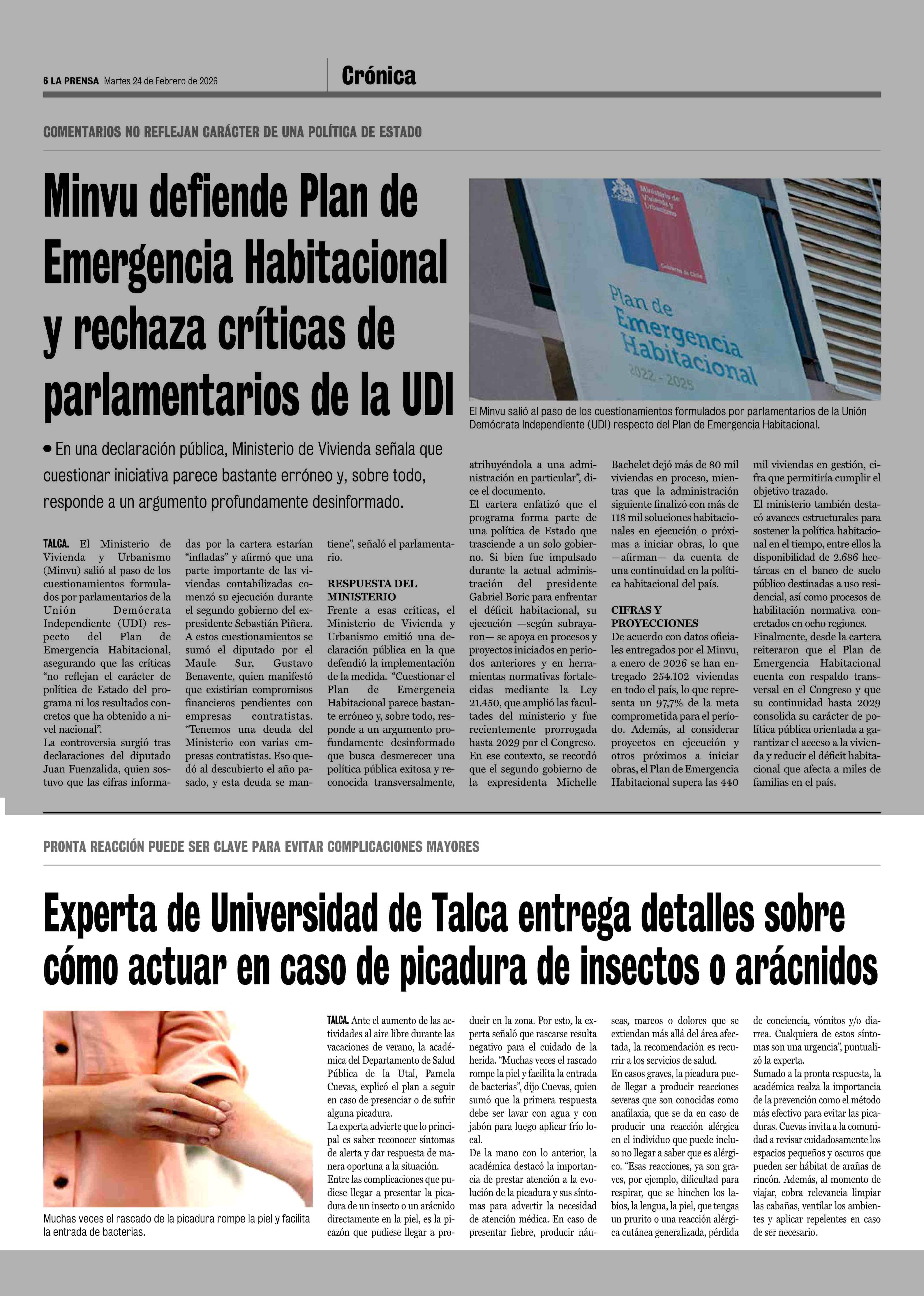 Experta de Universidad de Talca entrega detalles sobre cómo actuar en caso de picadura de insectos o arácnidos 24-02-2026 La Prensa de Curicó |