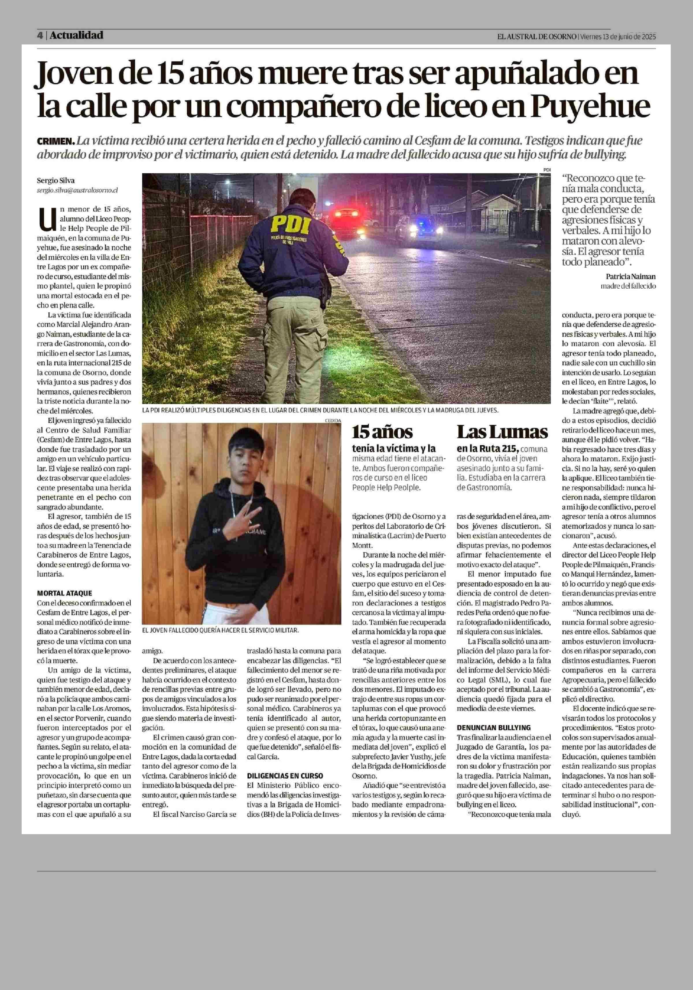 Joven de 15 años muere tras ser apuñalado en la calle por un compañero de liceo en Puyehue 13-06-2025 El Austral de Osorno |
