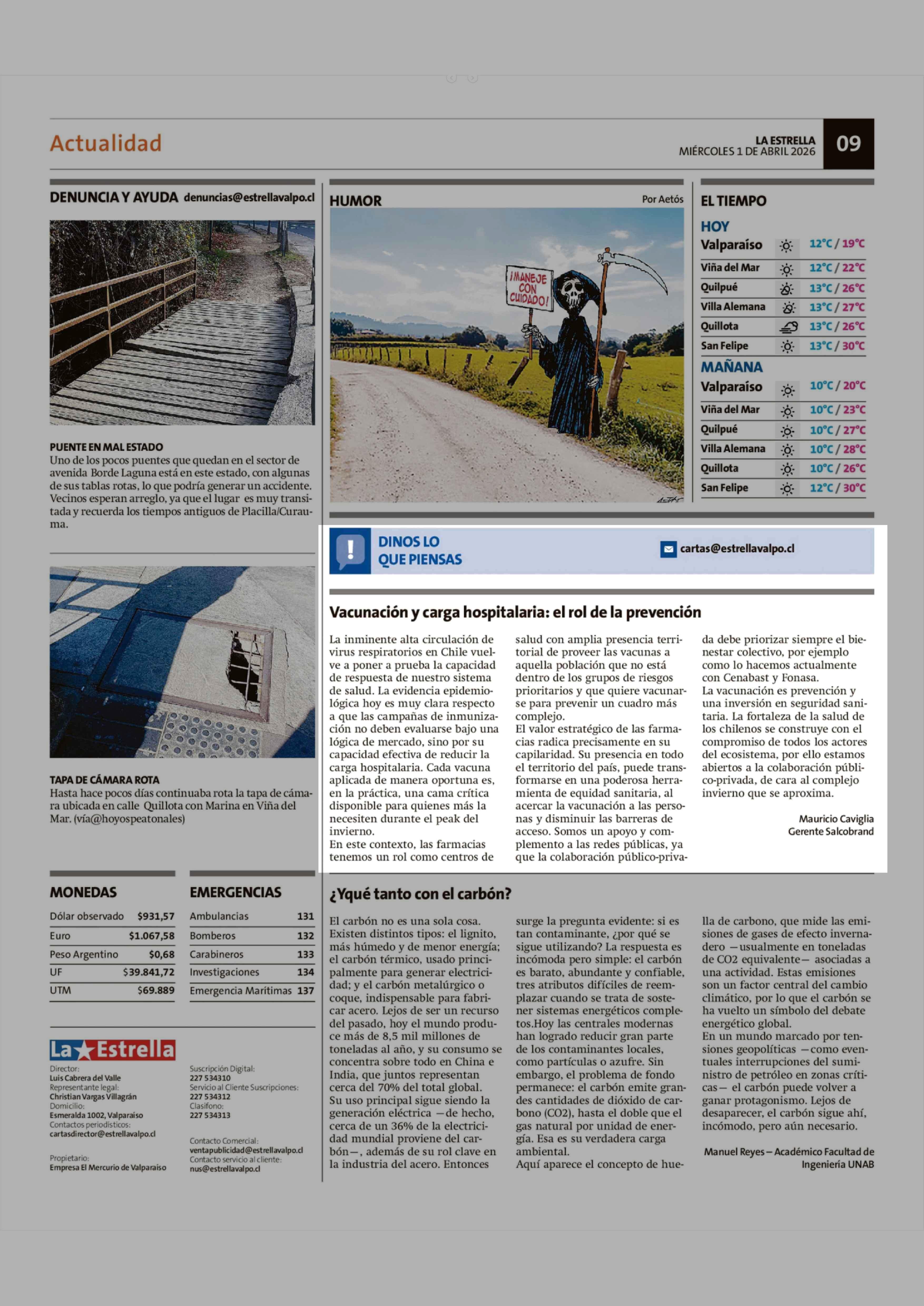 Columnas de Opinión: Vacunación y carga hospitalaria: el rol de la prevención 01-04-2026 La Estrella de Valparaíso |
