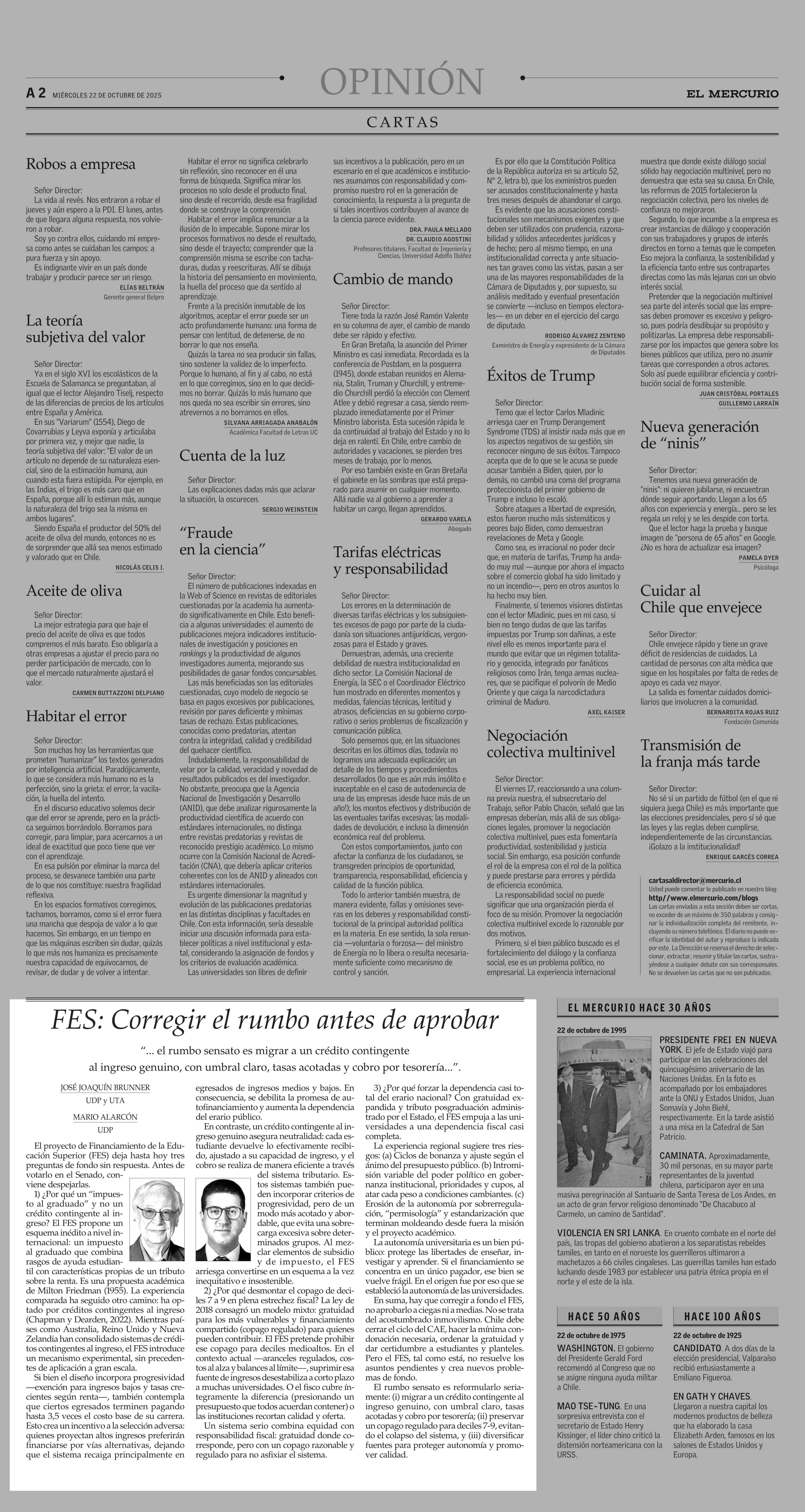 | COLUMNAS DE OPINIÓN: FES: Corregir el rumbo antes de aprobar 22-10-2025 El Mercurio |