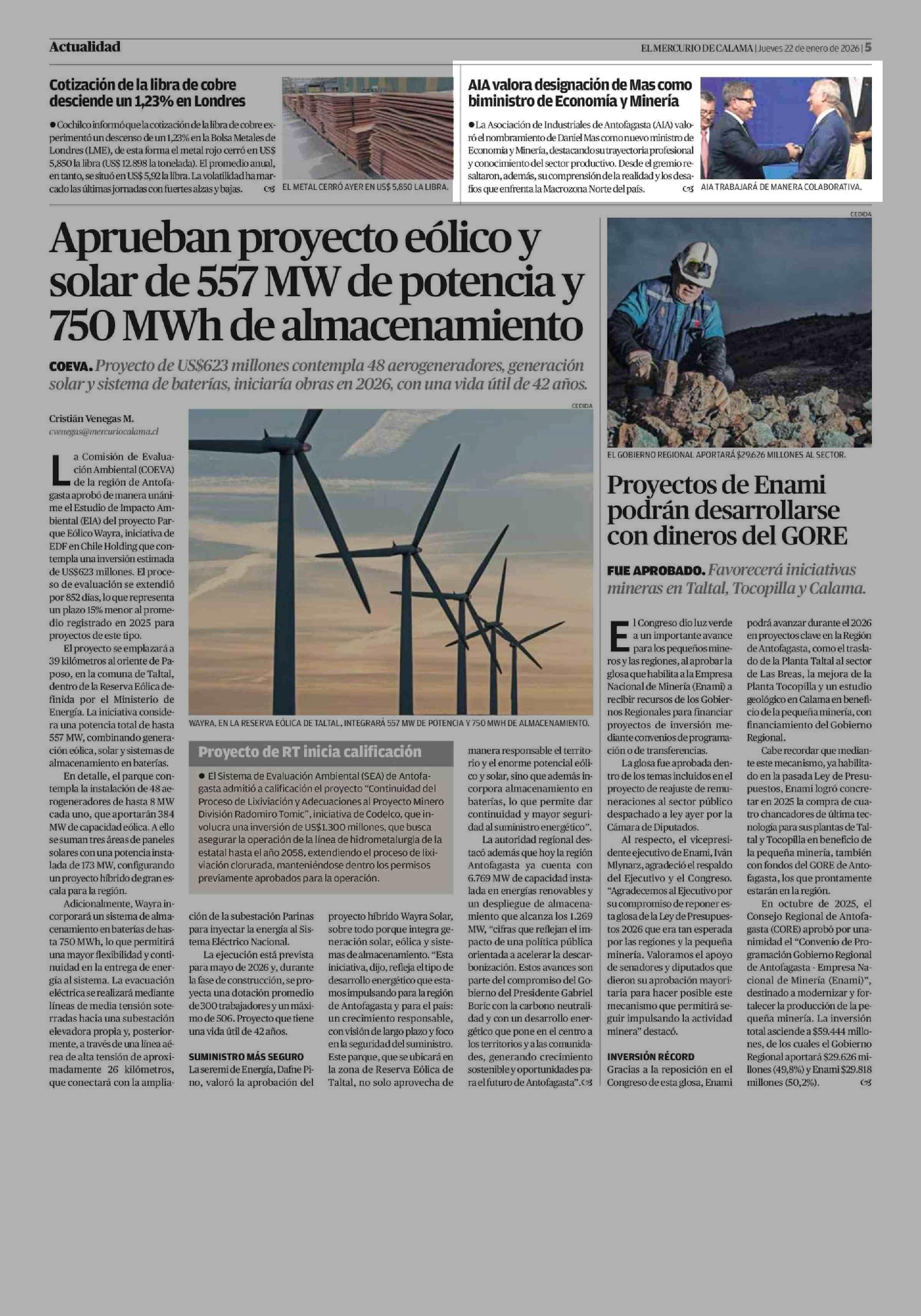 AIA valora designación de Mas como biministro de Economía y Minería 22-01-2026 El Mercurio de Calama |