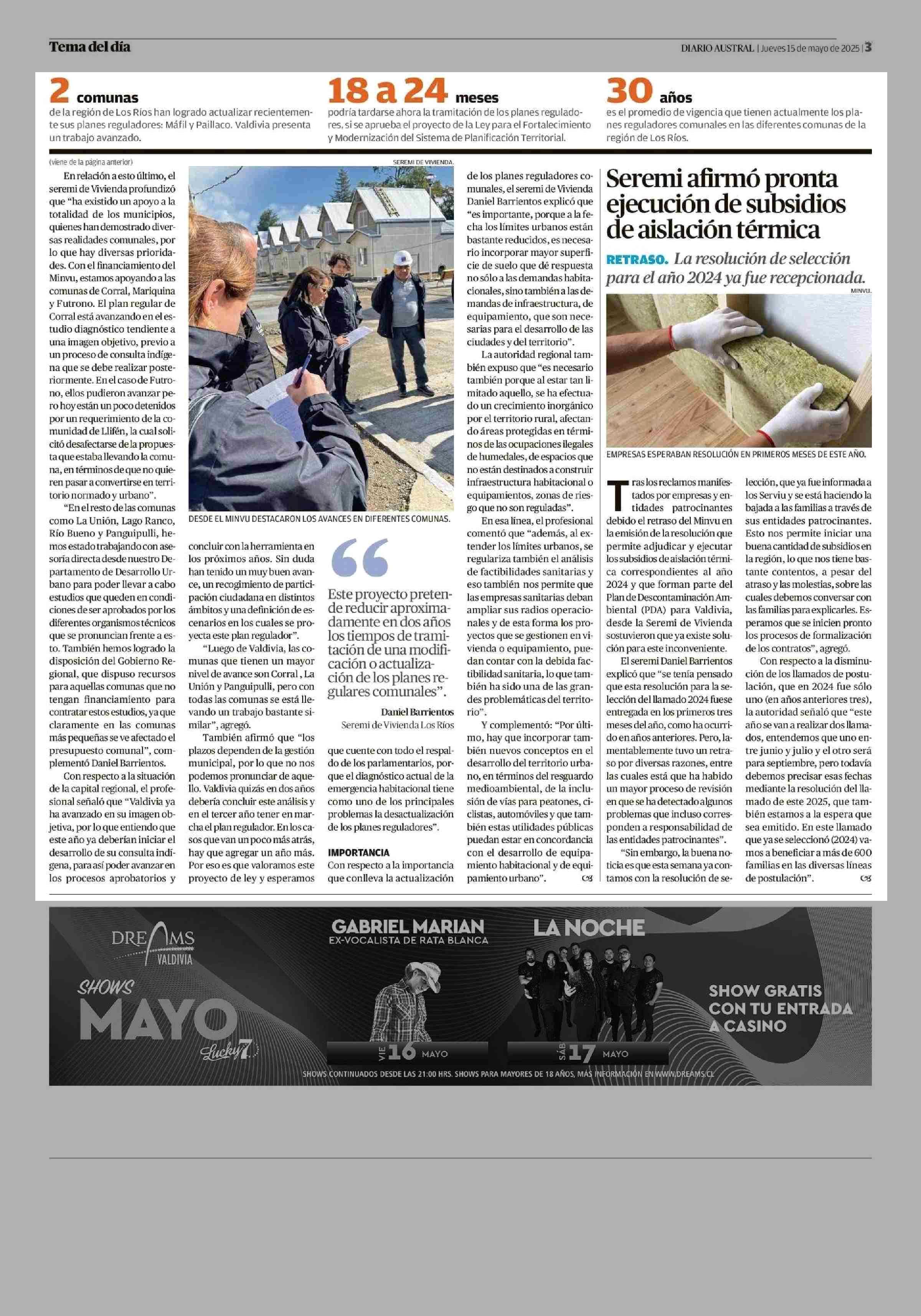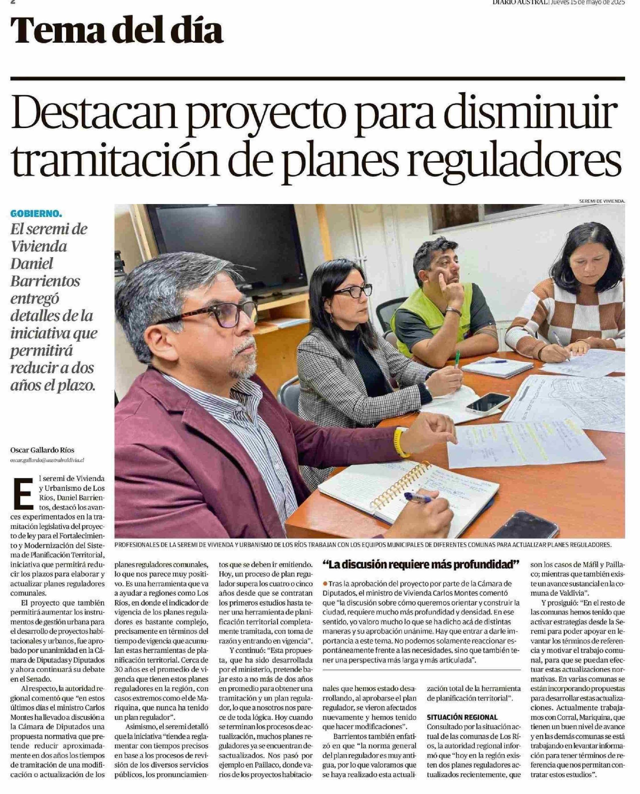 Destacan proyecto para disminuir tramitación de planes reguladores 15-05-2025 Diario Austral Región de Los Ríos |