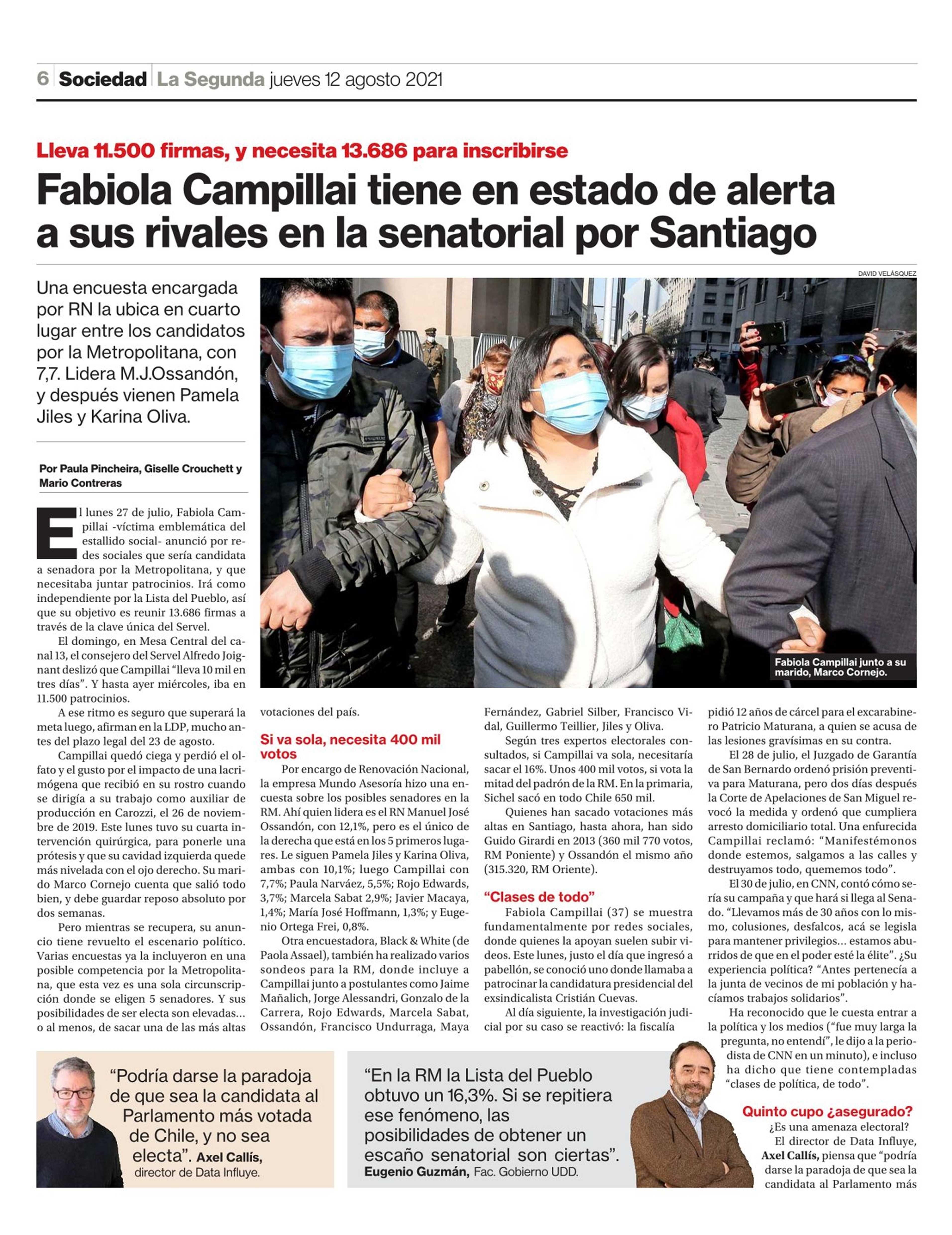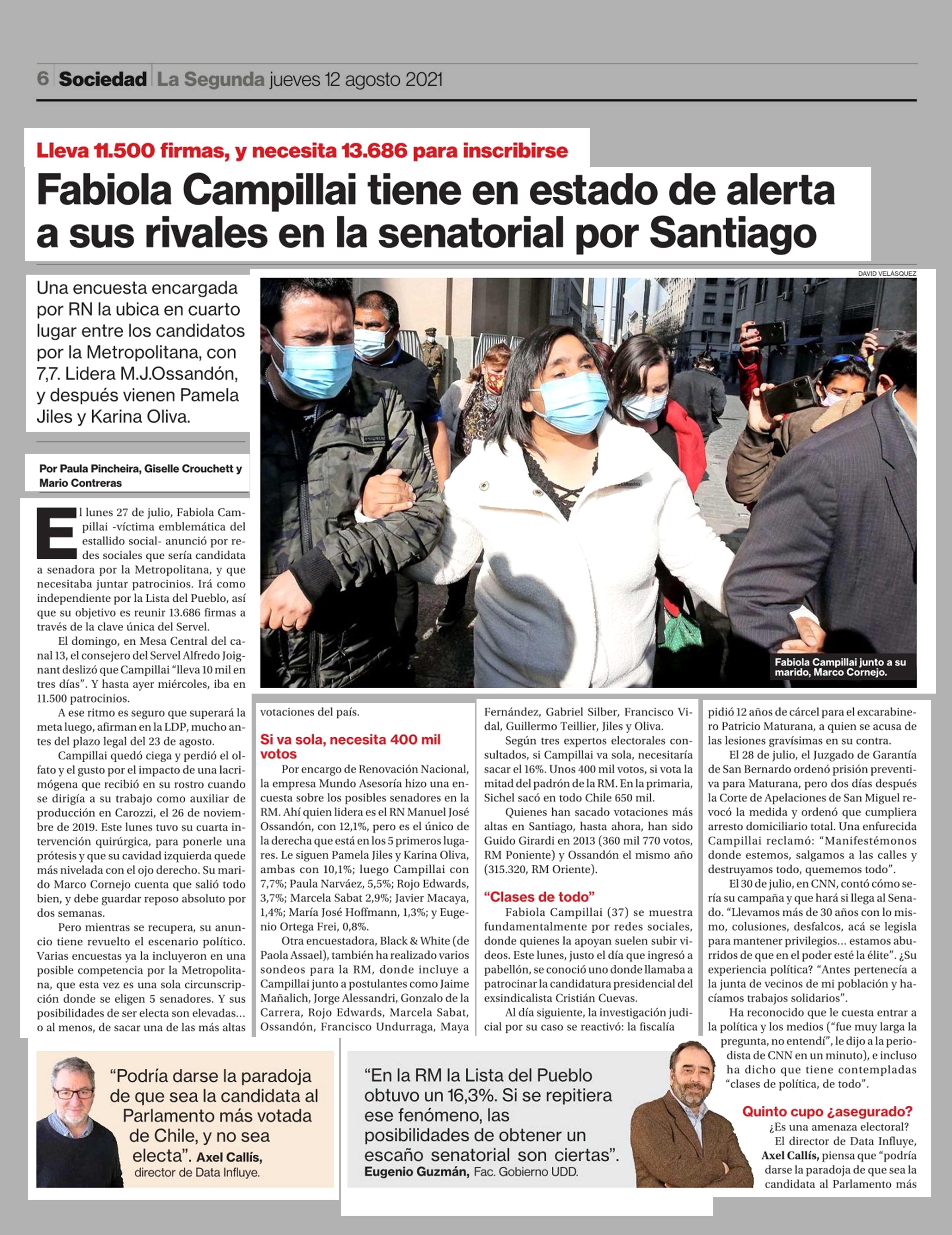 Fabiola Campillai tiene en estado de alerta a sus rivales en la senatorial por Santiago 12-08-2021 La Segunda |