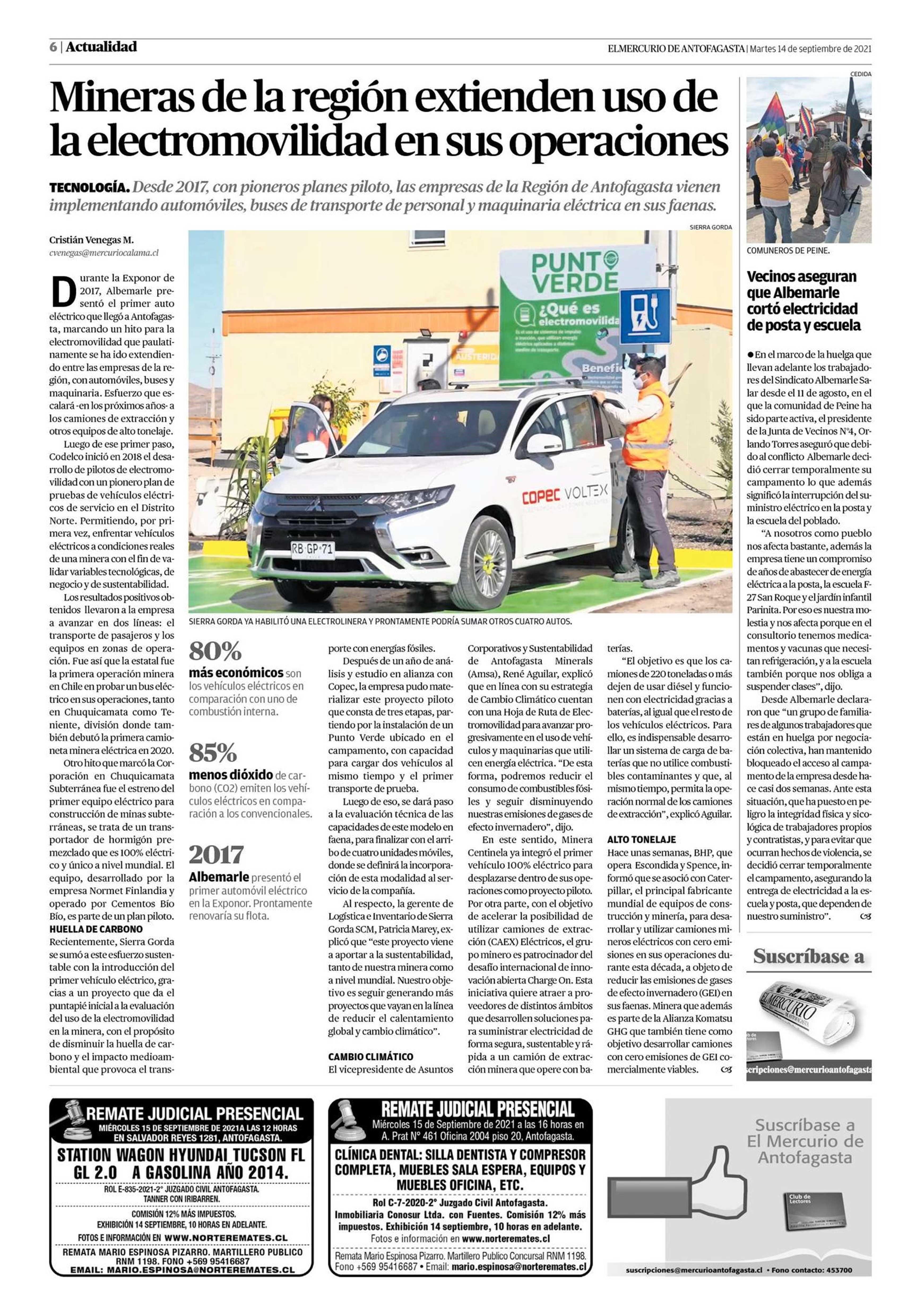 Mineras de la región extienden uso de la electromovilidad en sus operaciones 14-09-2021 El Mercurio de Antofagasta |