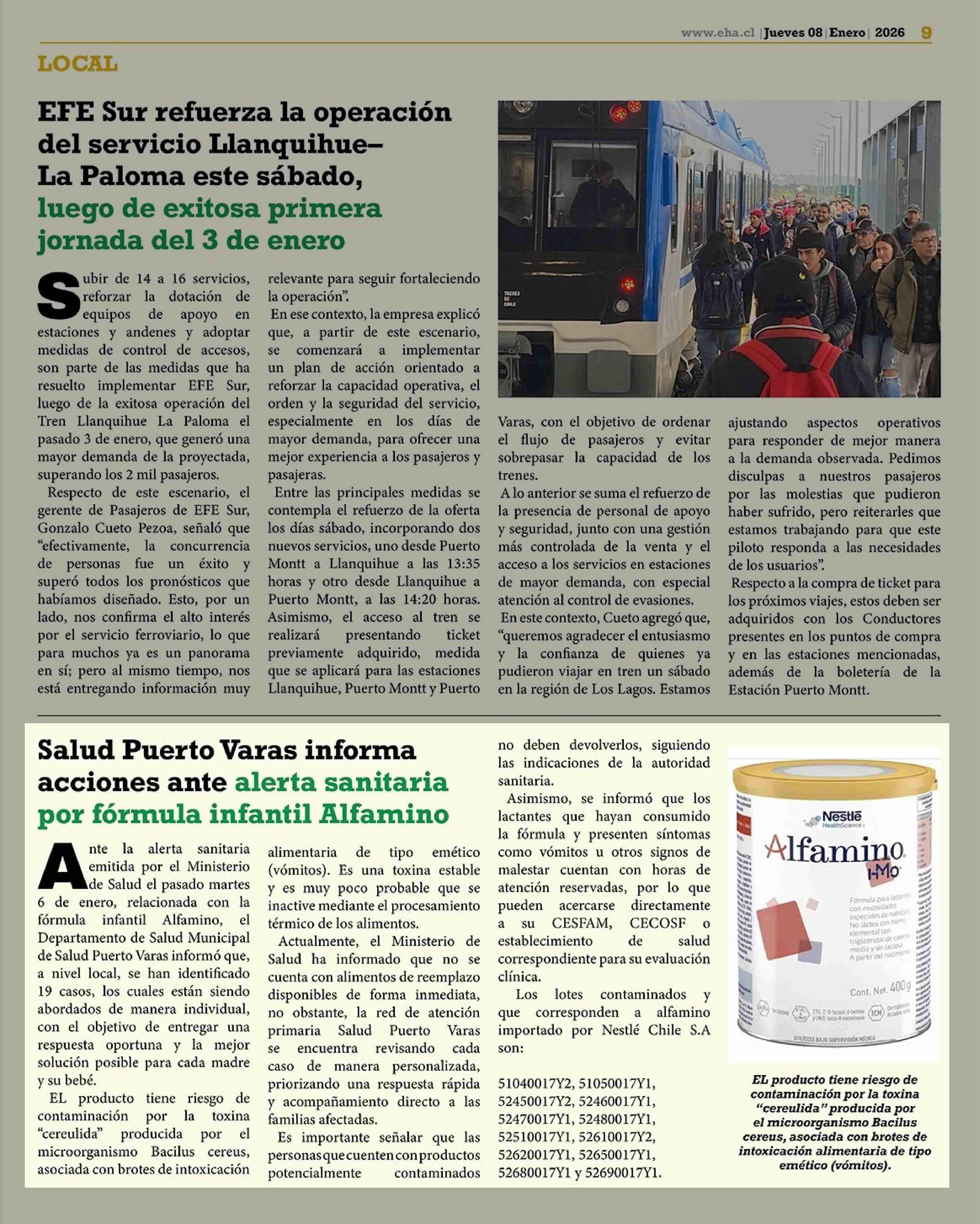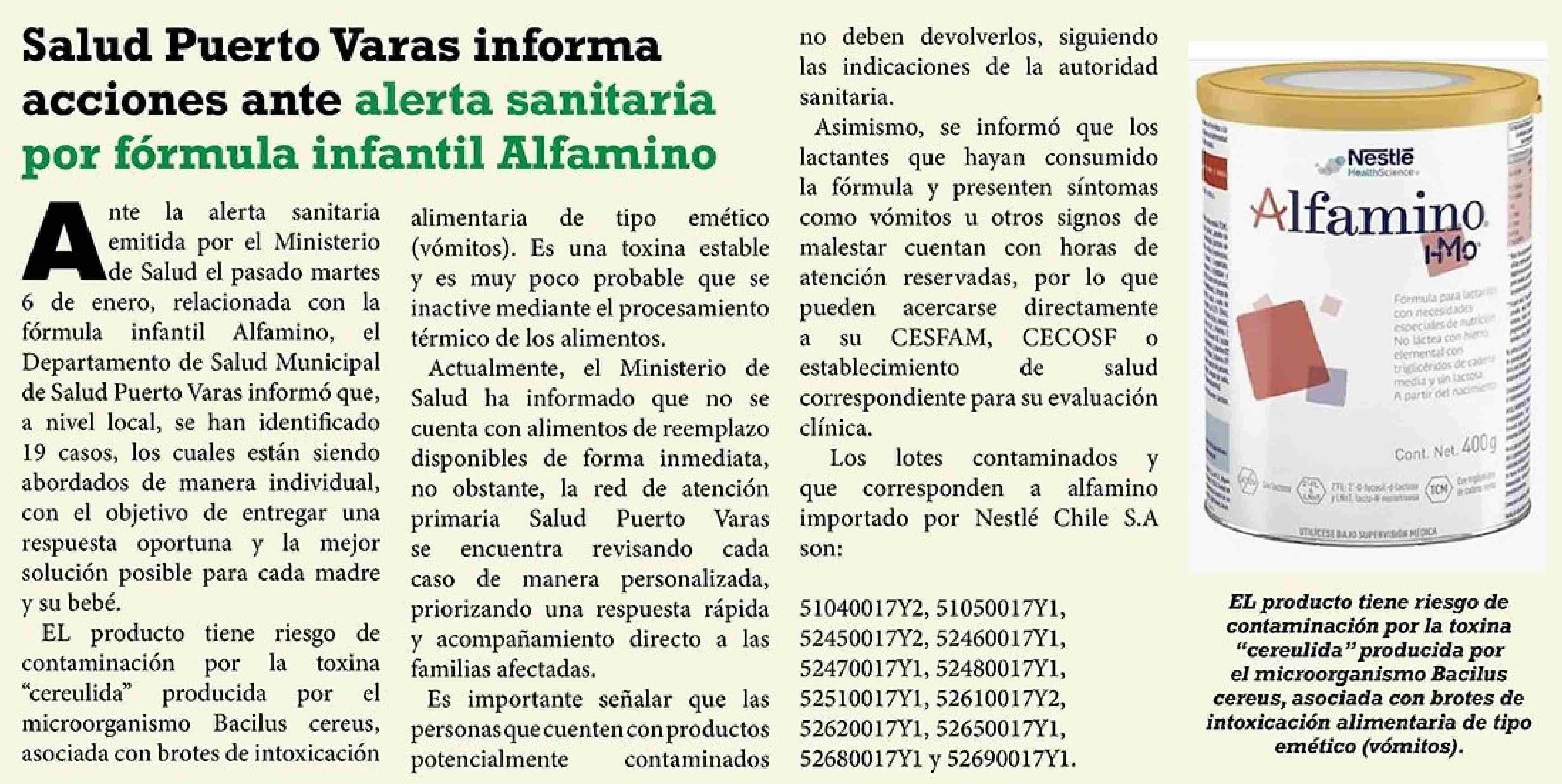 Salud Puerto Varas informa acciones ante alerta sanitaria por fórmula infantil Alfamino 08-01-2026 El Heraldo Austral |