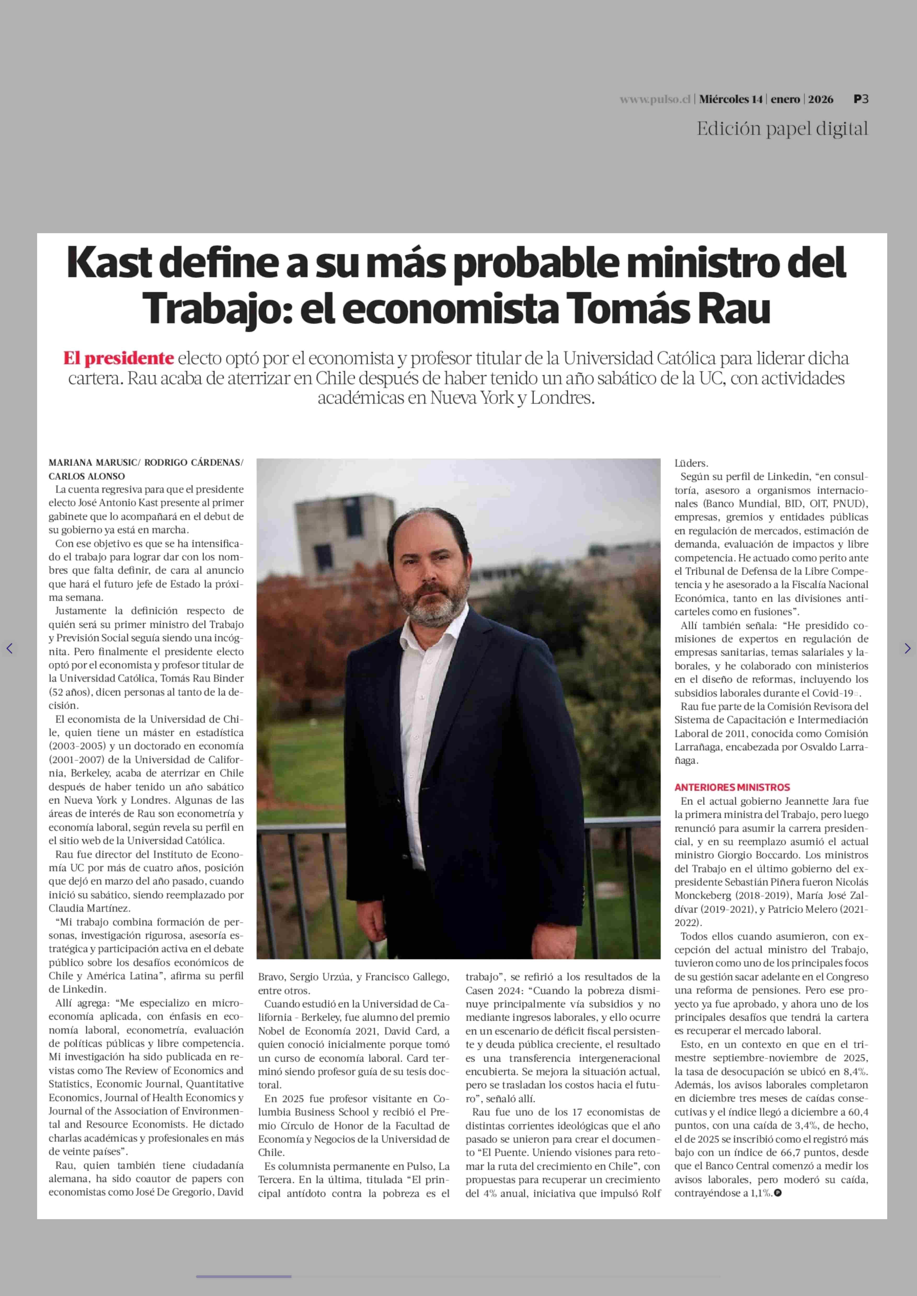 Título: Kast define a su más probable ministro del Trabajo: el economista Tomás Rau