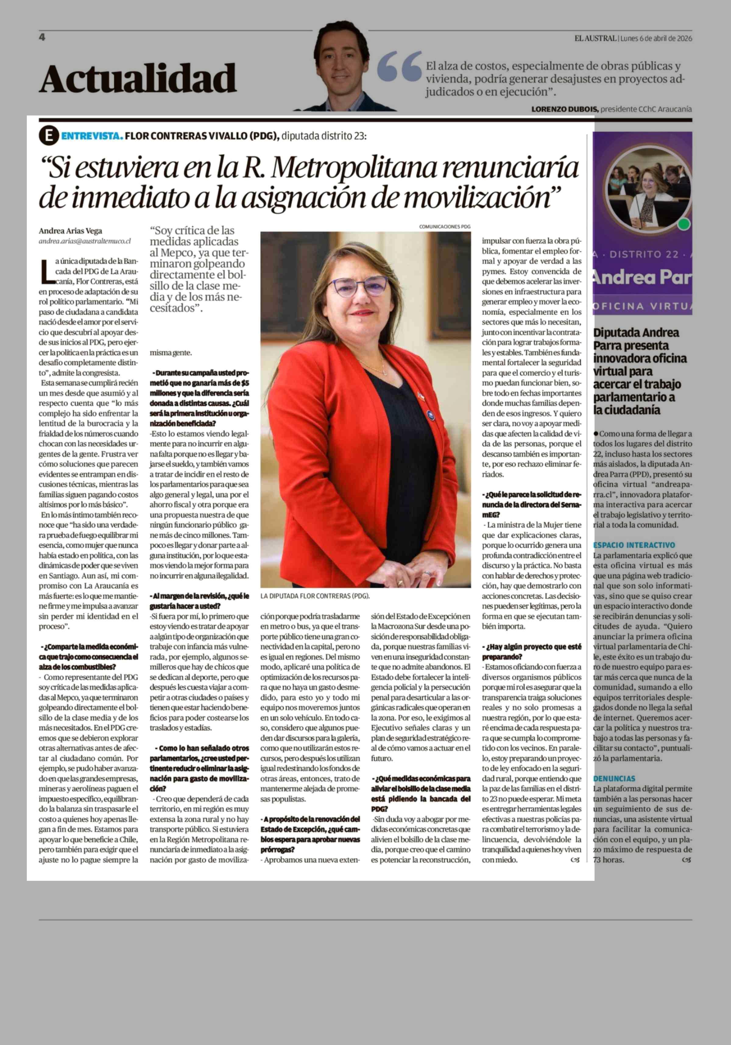 "Si estuviera en la R. Metropolitana renunciaría de inmediato a la asignación de movilización" 06-04-2026 El Austral de la Araucanía |
