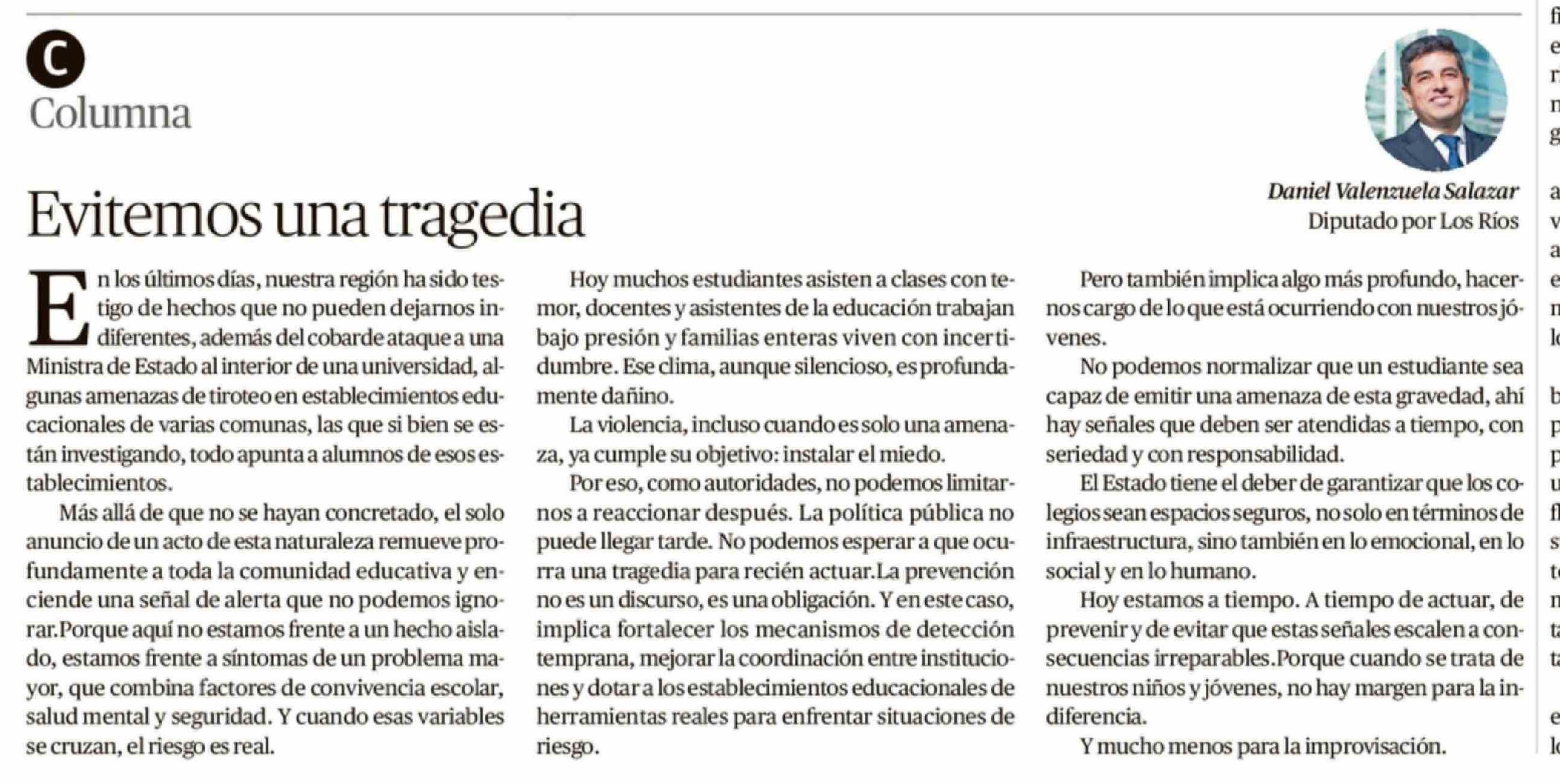 Columnas de Opinión: Evitemos una tragedia 11-04-2026 Diario Austral Región de Los Ríos |