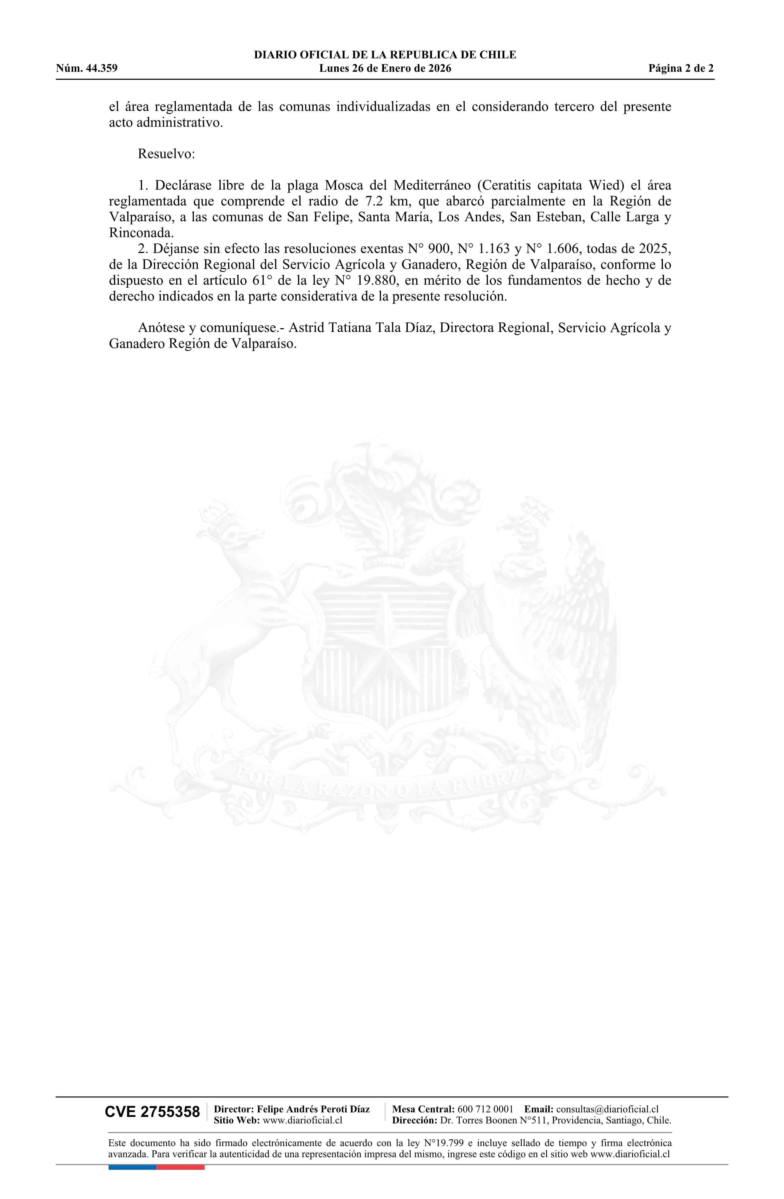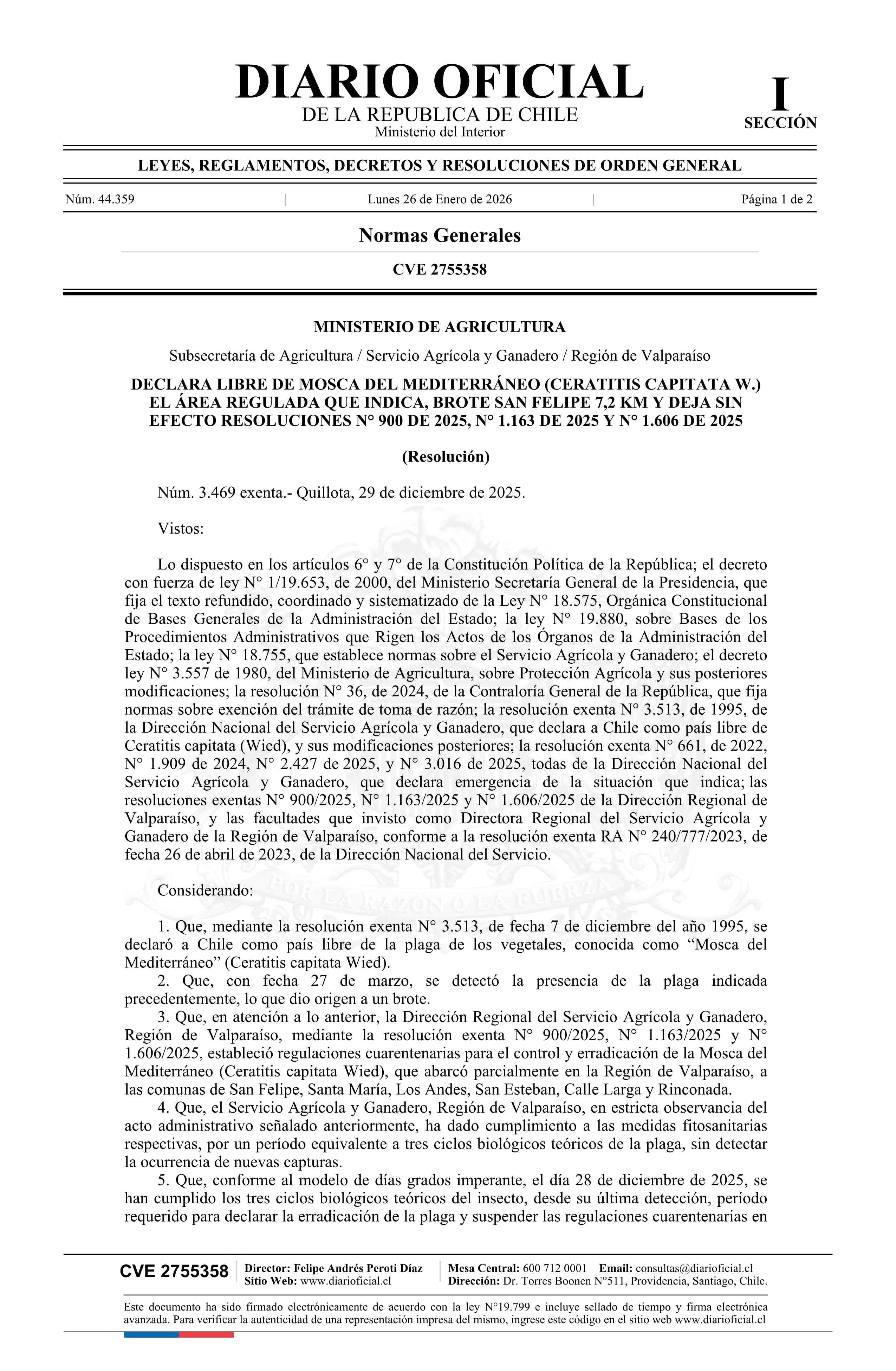 | Título: | Resolución exenta número 3.469, de 2025.- Declara libre de Mosca del Mediterráneo (Ceratitis capitata W.) el área regulada que indica: Brote San Felipe 7,2 Km y deja sin efecto resoluciones exentas Nos. 900, 1.163 y 1.606, todas de 2025 |