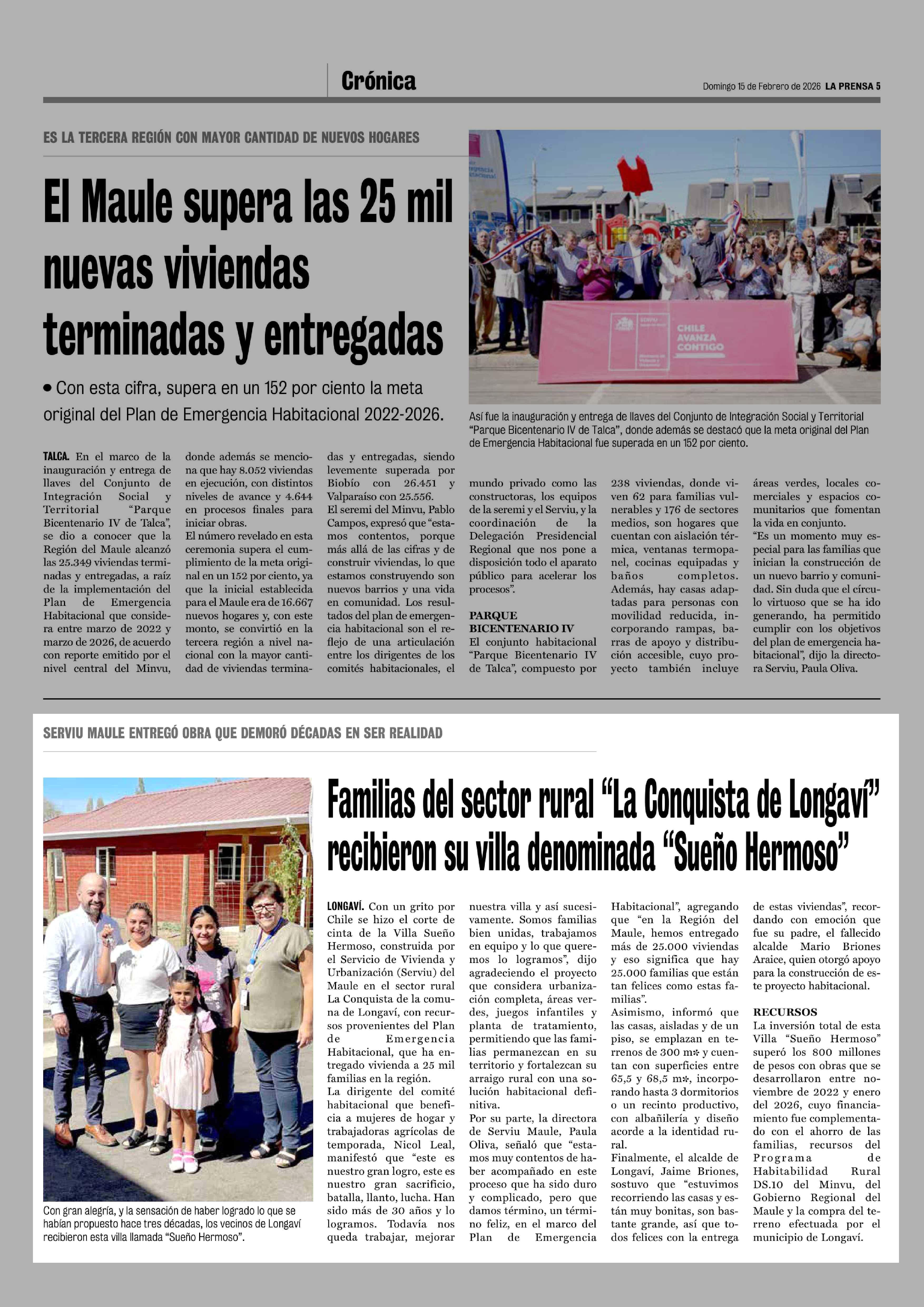Familias del sector rural "La Conquista de Longaví" recibieron su villa denominada "Sueño Hermoso" 15-02-2026 La Prensa de Curicó |