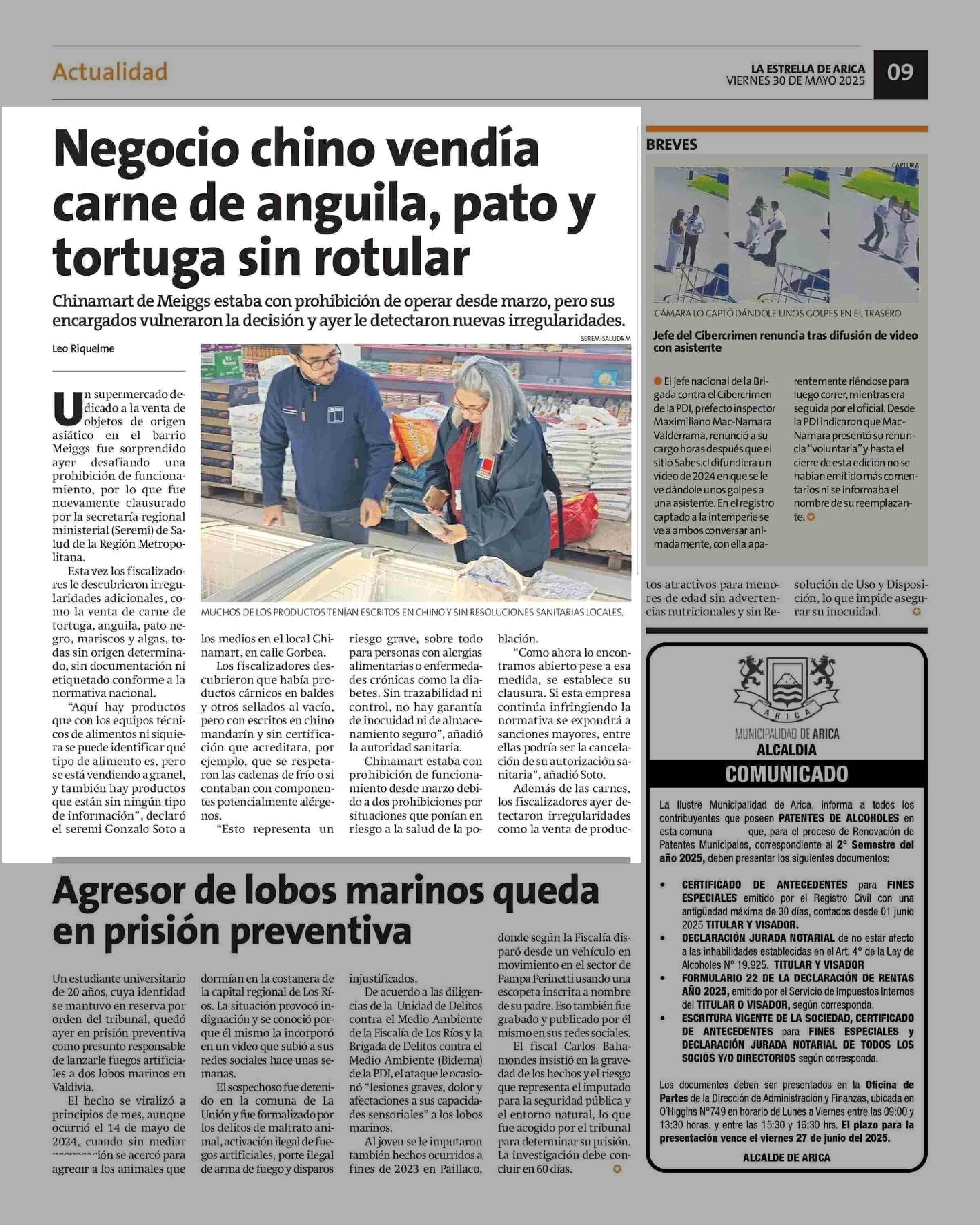 Negocio chino vendía carne de anguila, pato y tortuga sin rotular 30-05-2025 La Estrella de Arica |