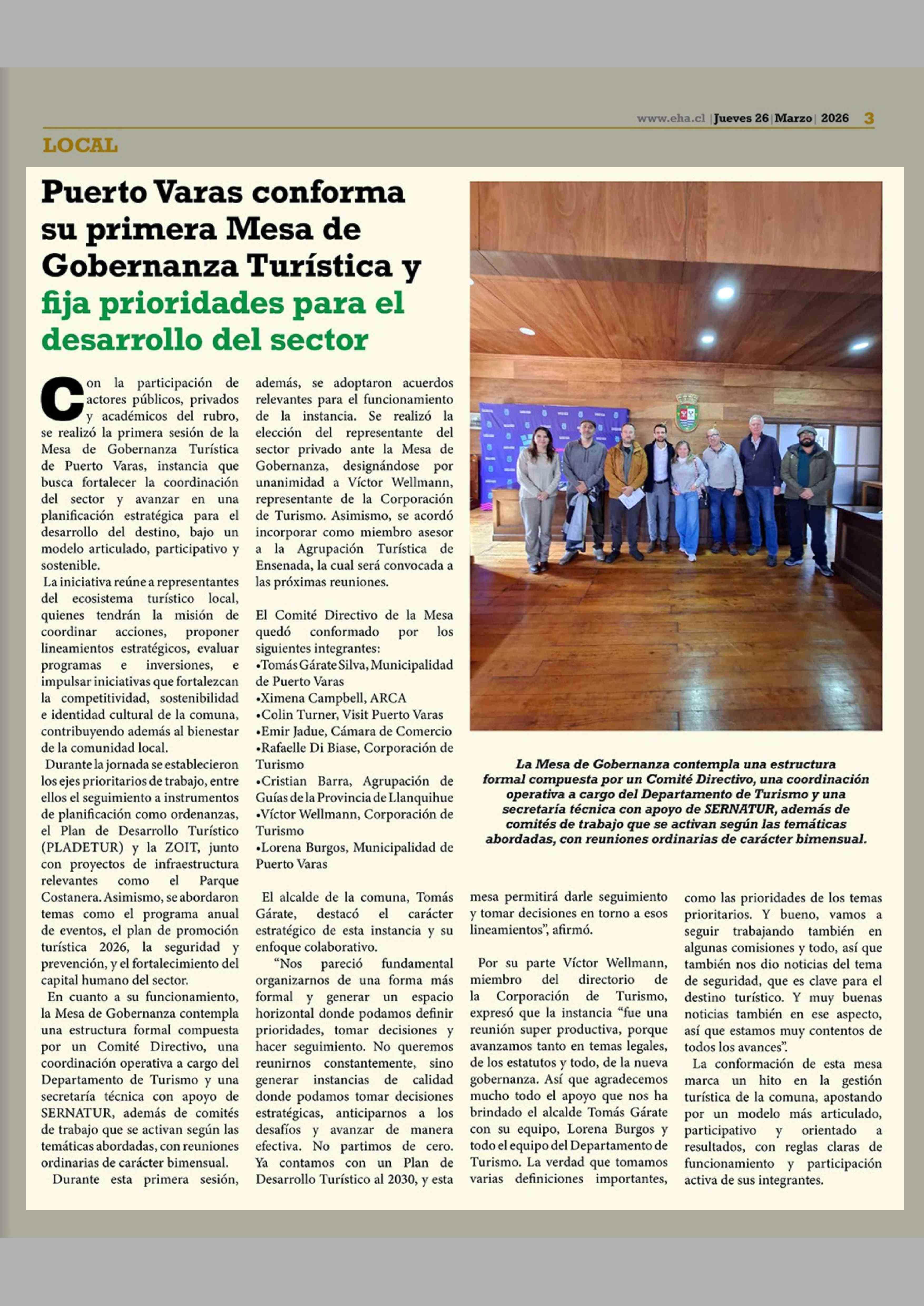 Puerto Varas conforma su primera Mesa de Gobernanza Turística y fija prioridades para el desarrollo del sector 26-03-2026 El Heraldo Austral |