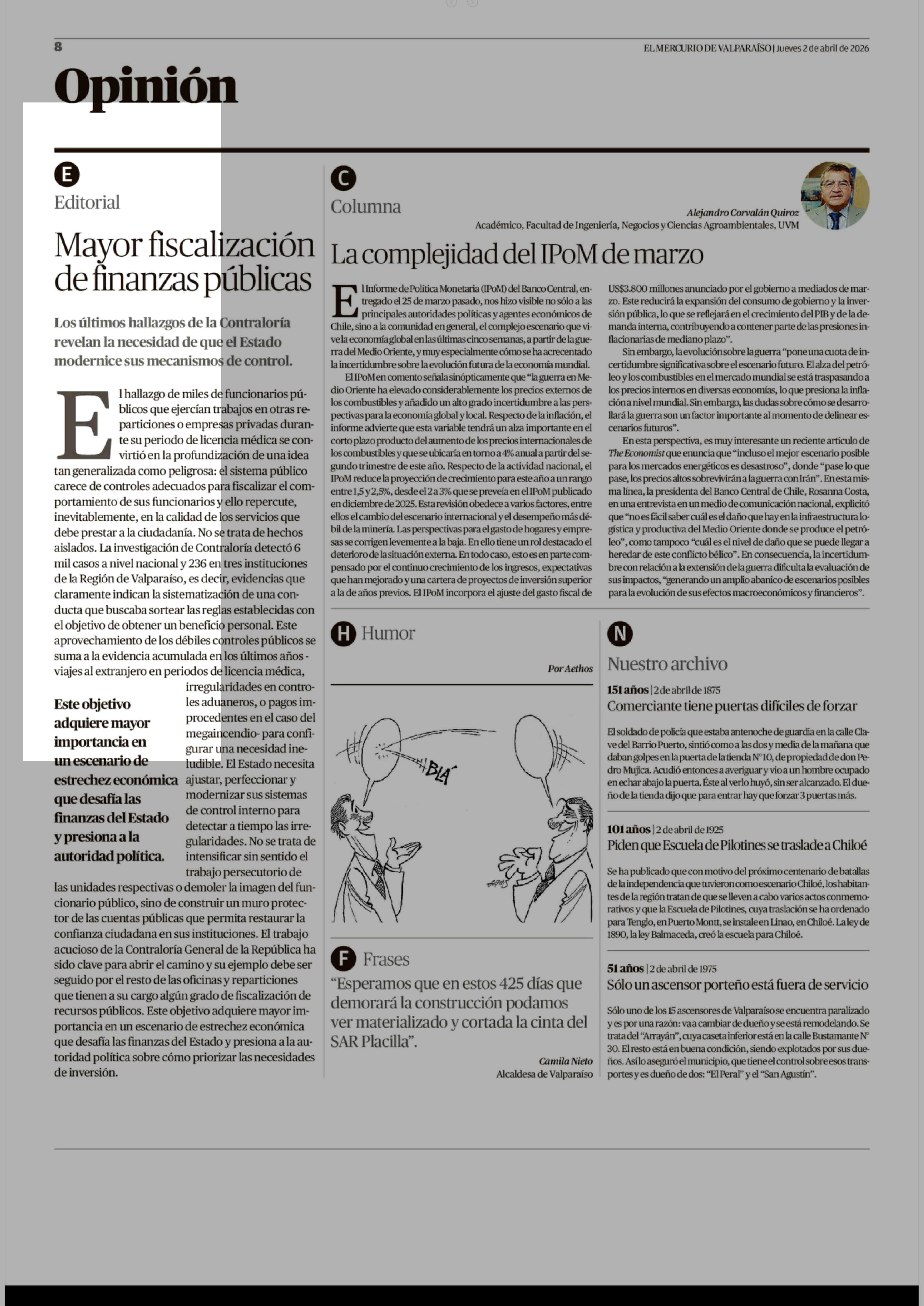 Editorial: Mayor fiscalización de finanzas públicas 02-04-2026 El Mercurio de Valparaíso |