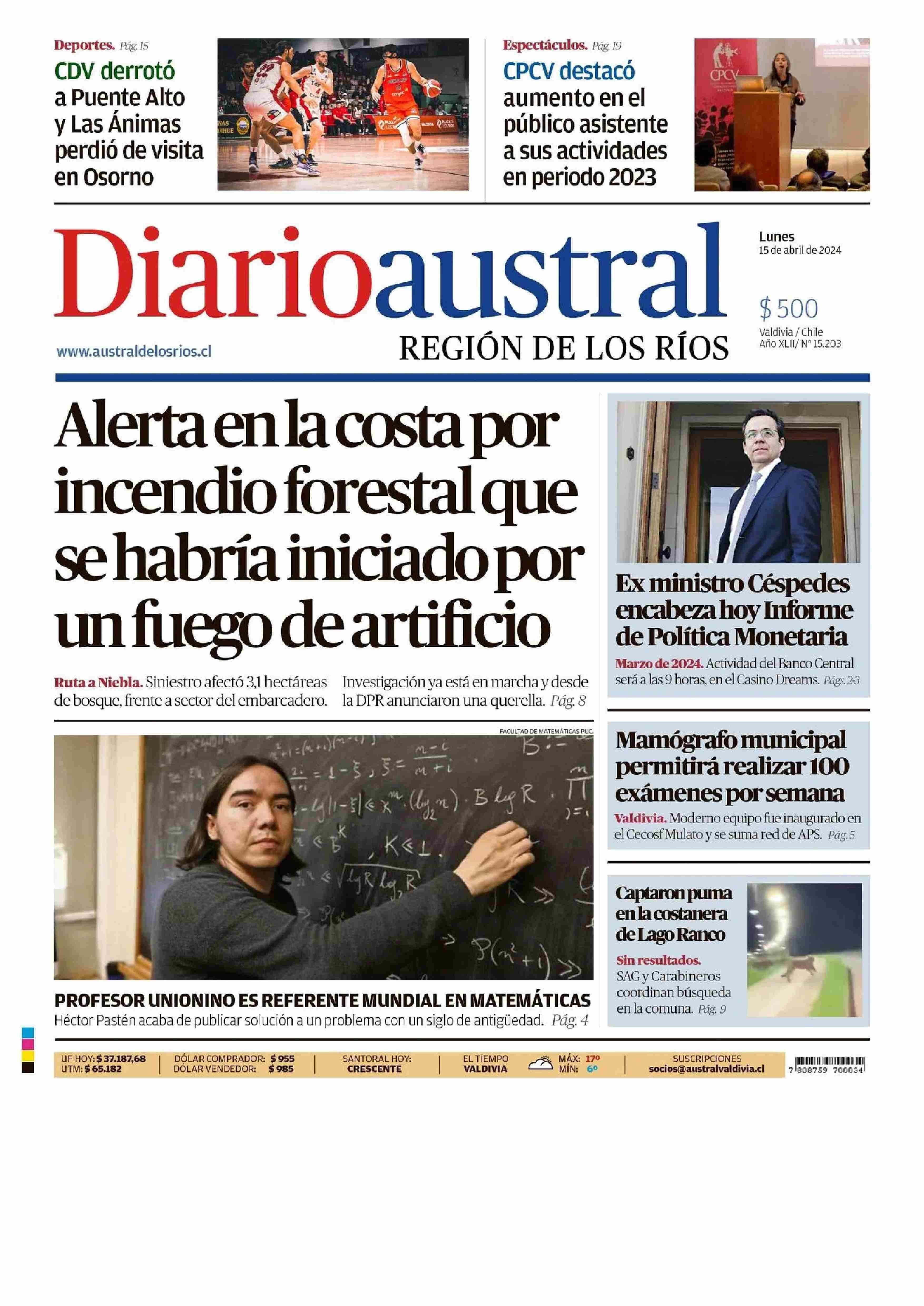 PORTADA EL AUSTRAL DE LOS RÍOS - CHILE 15-04-2024 Diario Austral Región de Los Ríos |