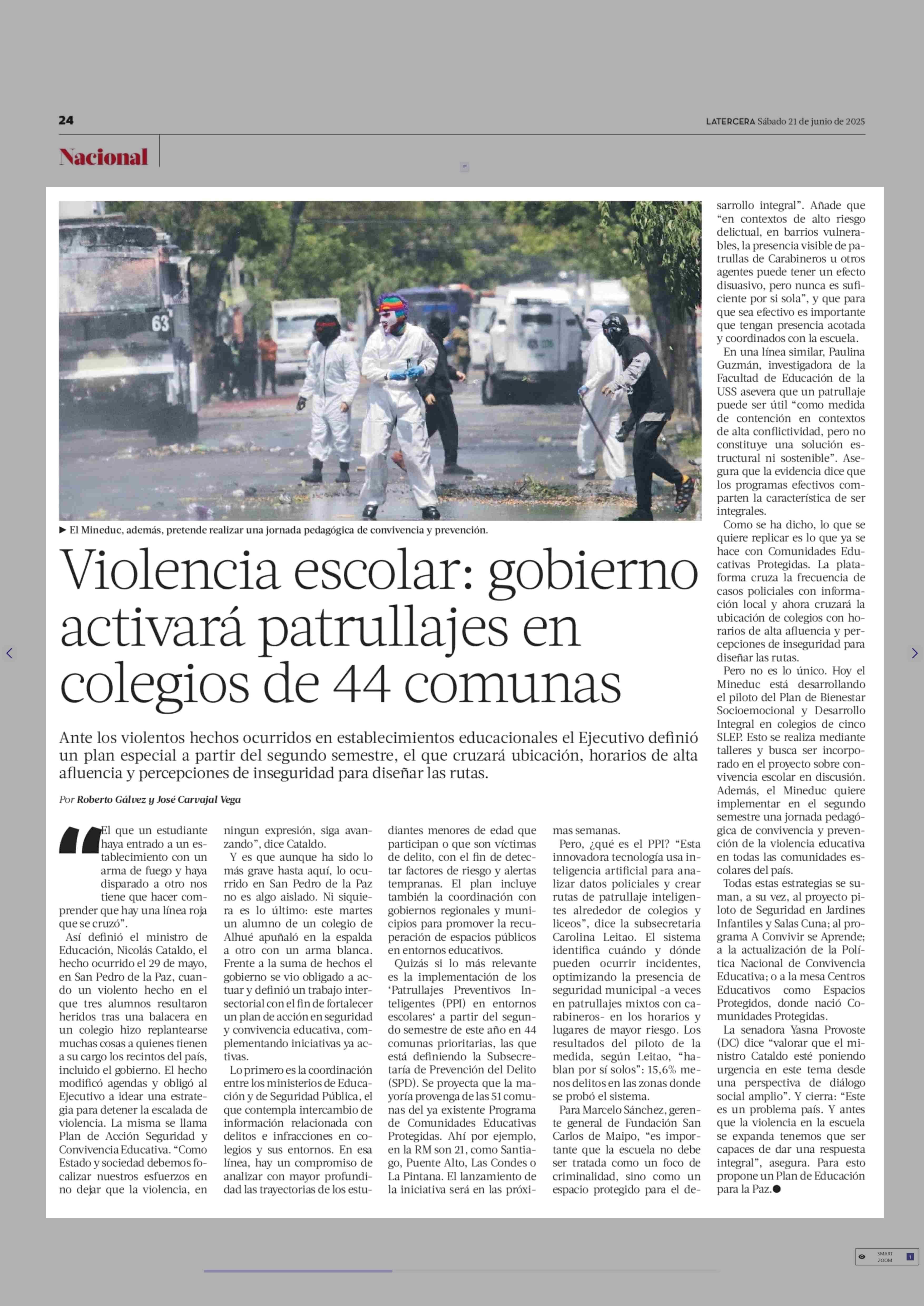 Violencia escolar: gobierno activará patrullajes en colegios de 44 comunas 21-06-2025 La Tercera |